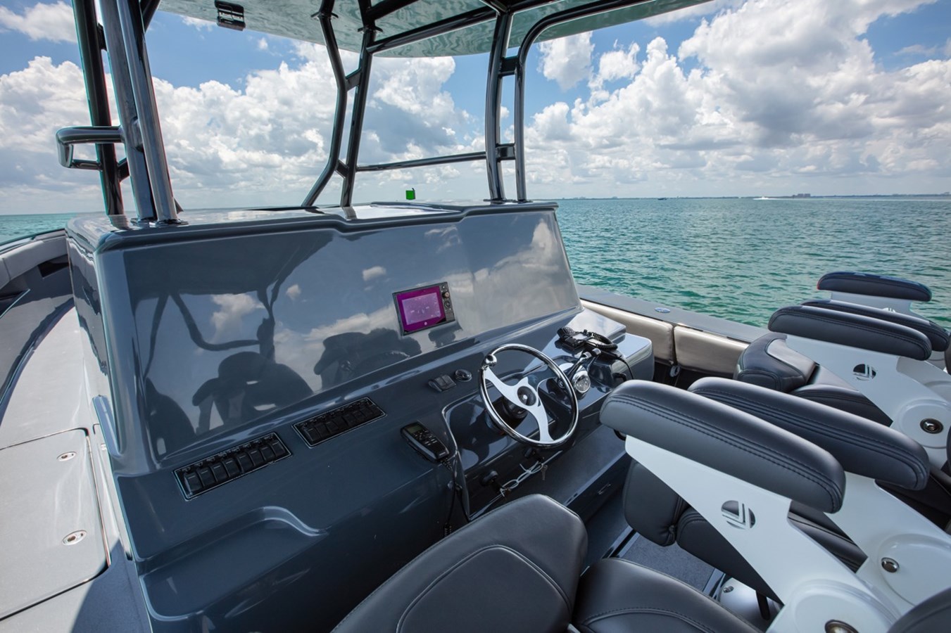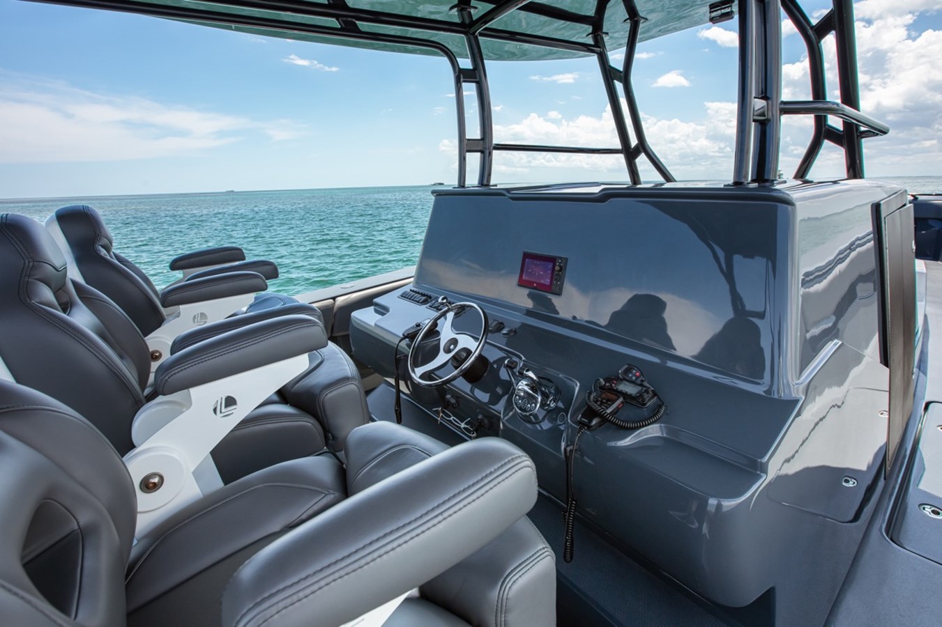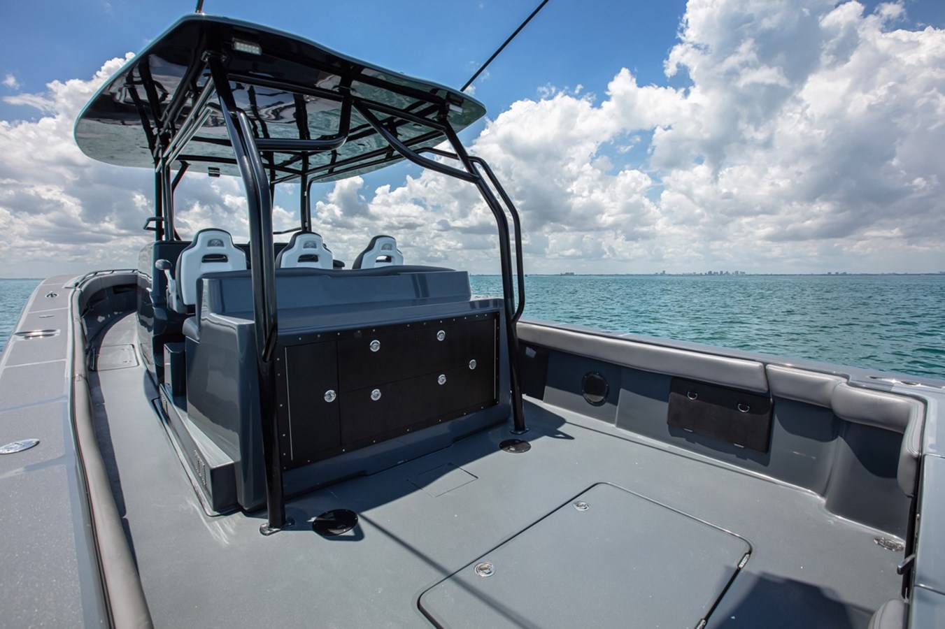 BRAND NEW CUSTOM 45' CUSTOMIZE AND FINISH TO YOUR LIKING! AVAILABLE NOW FOR IMMEDIATE DELIVERY First row seating w/ arm rest & fold-up bolsters Second row upholstered bench seating Nav/ Anchor lights Overhead lights Freshwater Oversized custom hardtop Bathroom Wall mounted control panel