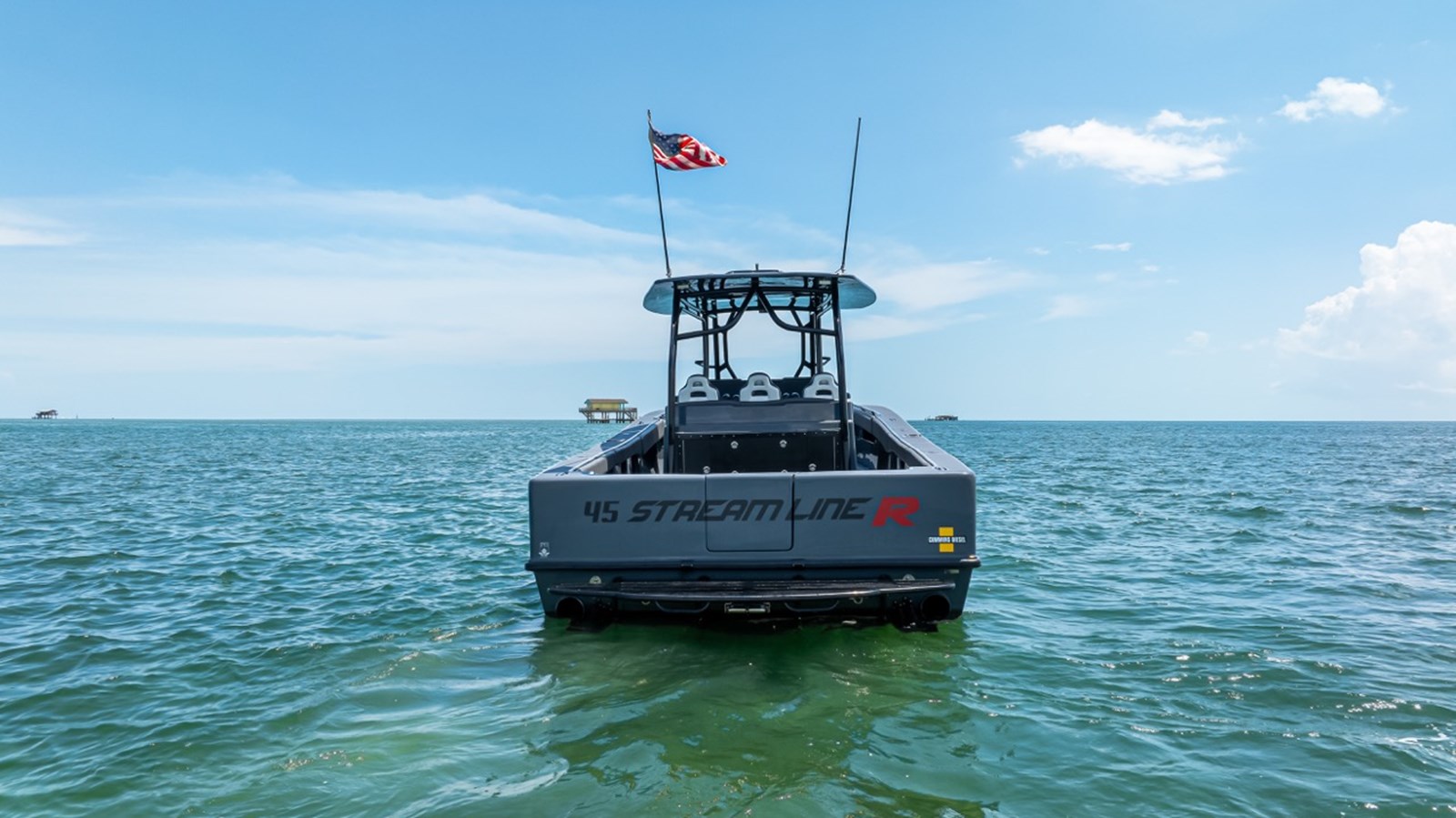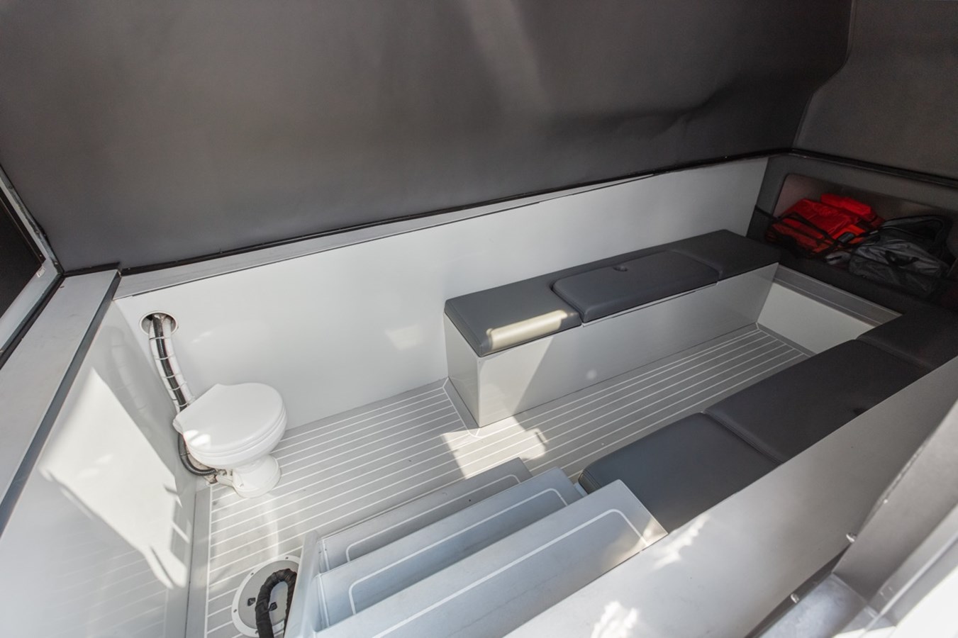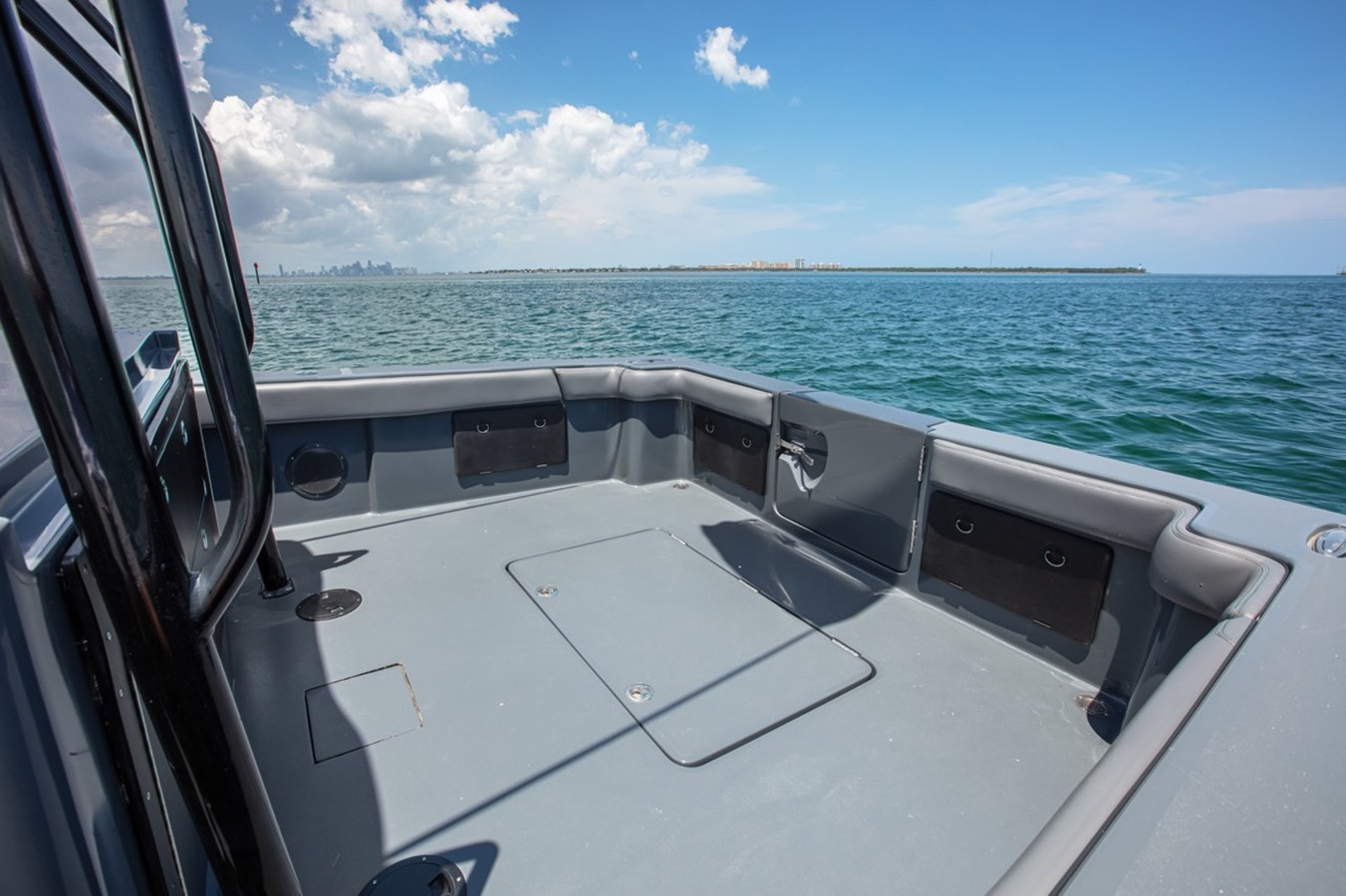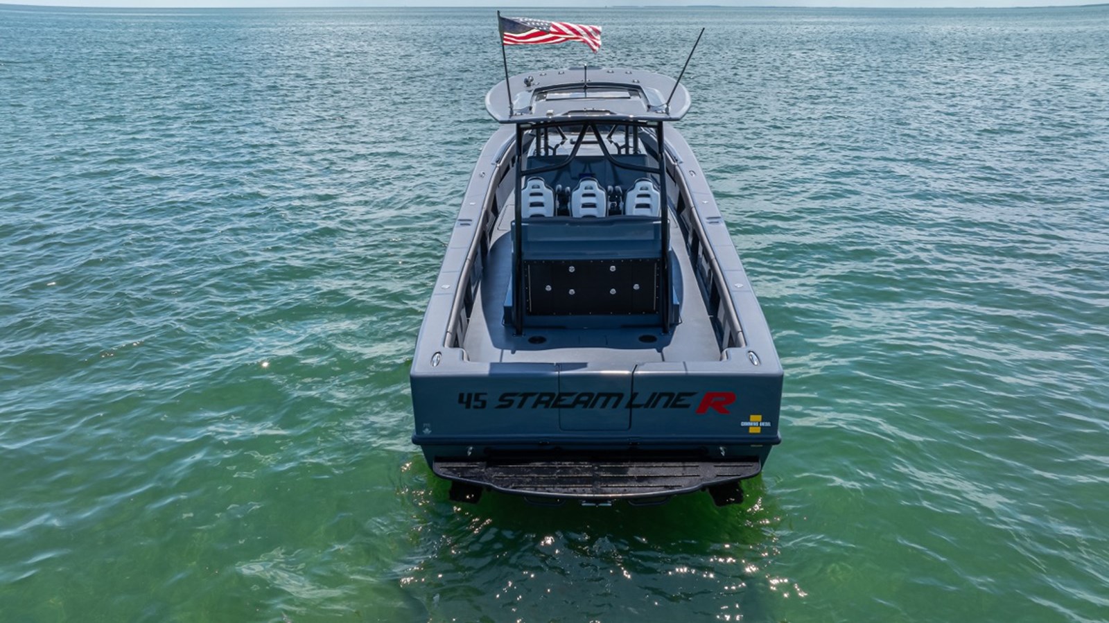 BRAND NEW CUSTOM 45' CUSTOMIZE AND FINISH TO YOUR LIKING! AVAILABLE NOW FOR IMMEDIATE DELIVERY First row seating w/ arm rest & fold-up bolsters Second row upholstered bench seating Nav/ Anchor lights Overhead lights Freshwater Oversized custom hardtop Bathroom Wall mounted control panel