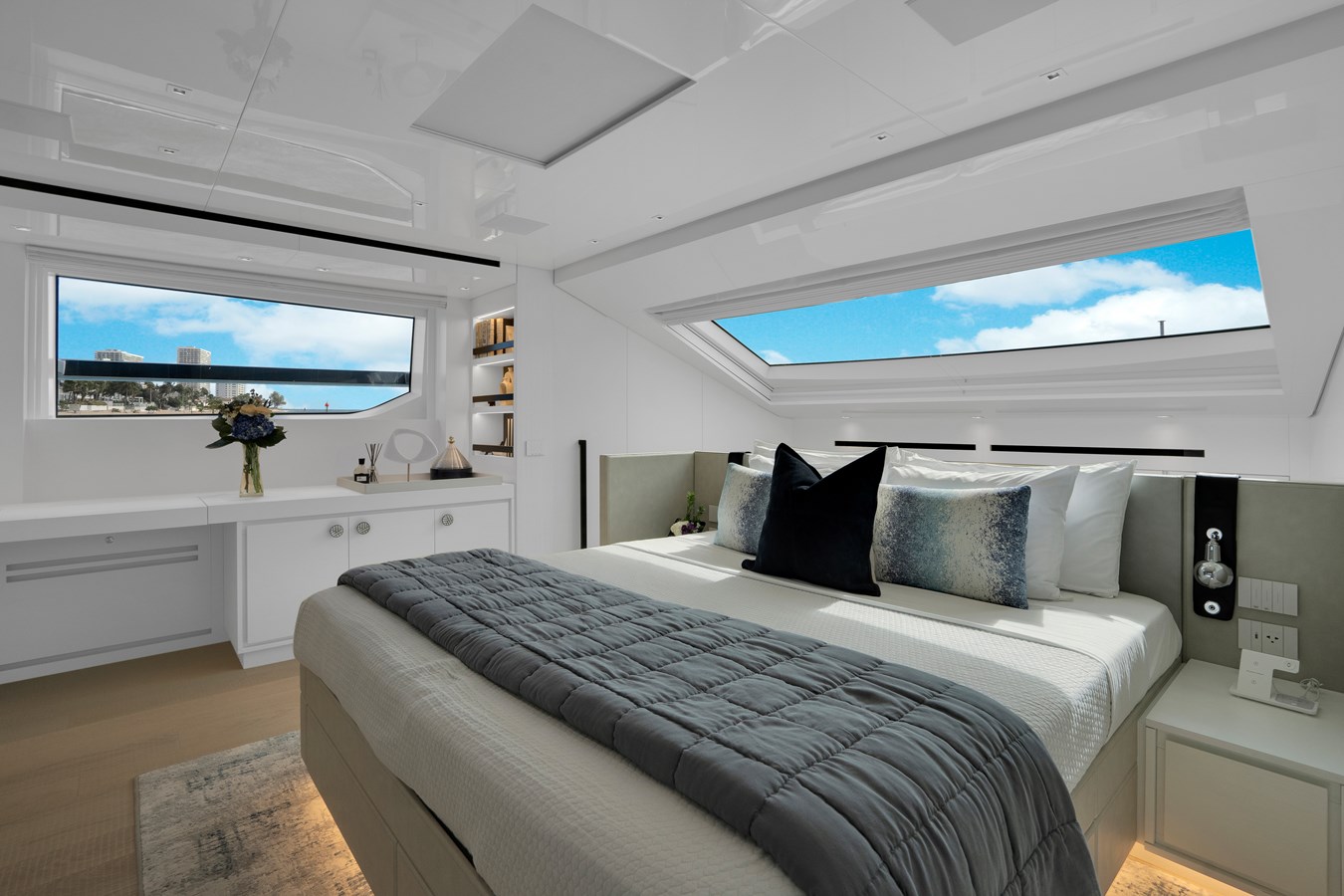 SWEET VIRGINIA is an impressive 2023 SL96A, featuring an innovative asymmetrical design that increases main deck volume by 15%. The salon is bathed in natural light thanks to floor-to-ceiling windows, creating a harmonious connection with the ocean views.