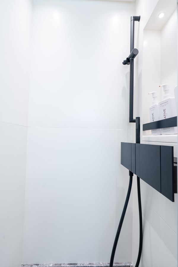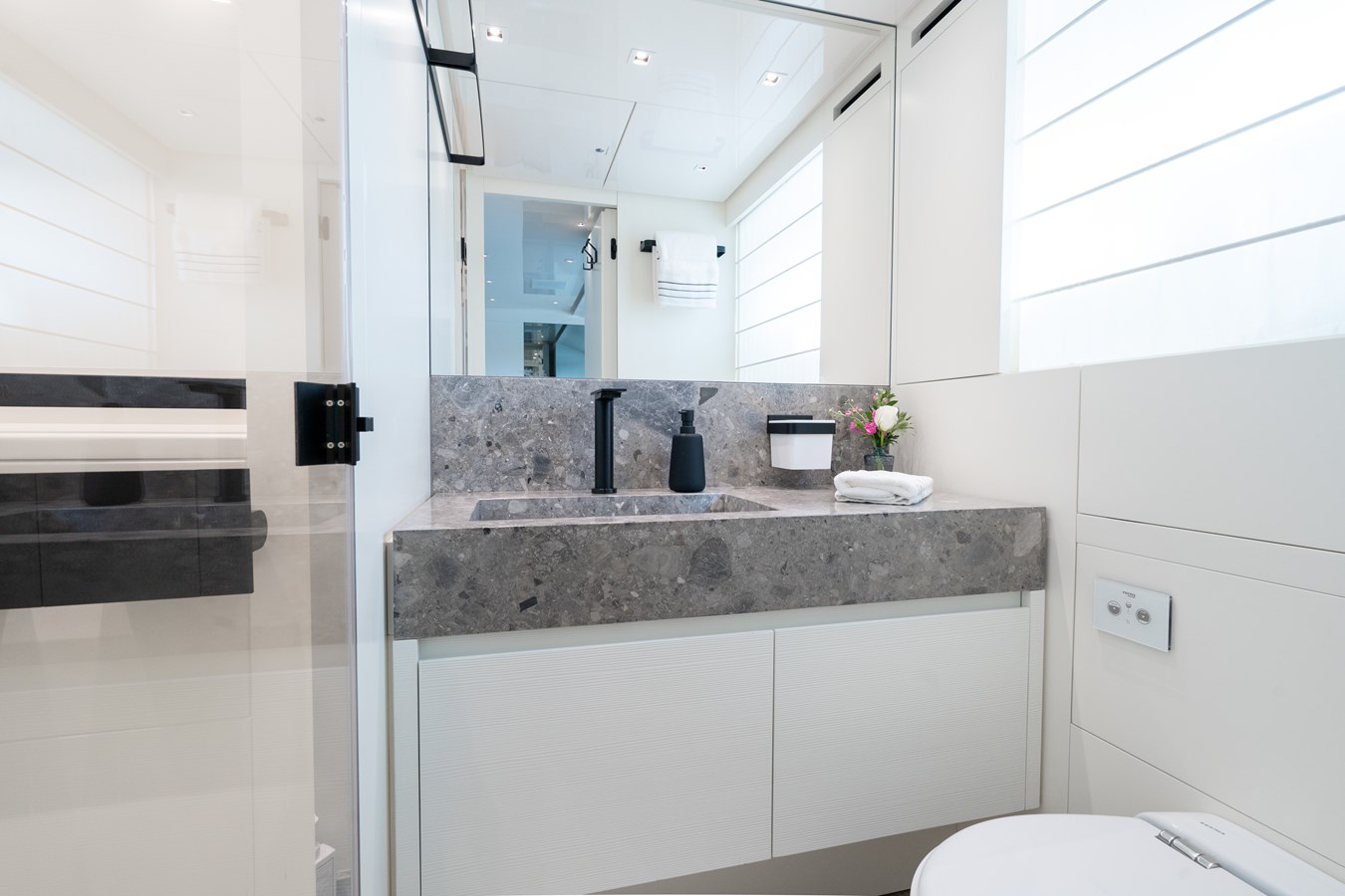 To port and forward one will find a guest corridor with day head. Continuing forward, one will find the Owner’s Stateroom. The Owner’s suite offers a king berth, and a large ensuite bath with stone sink and shower, toilet and bidet. The owner’s area offers ample storage and walk-in closet that is forward and down a couple of stairs.