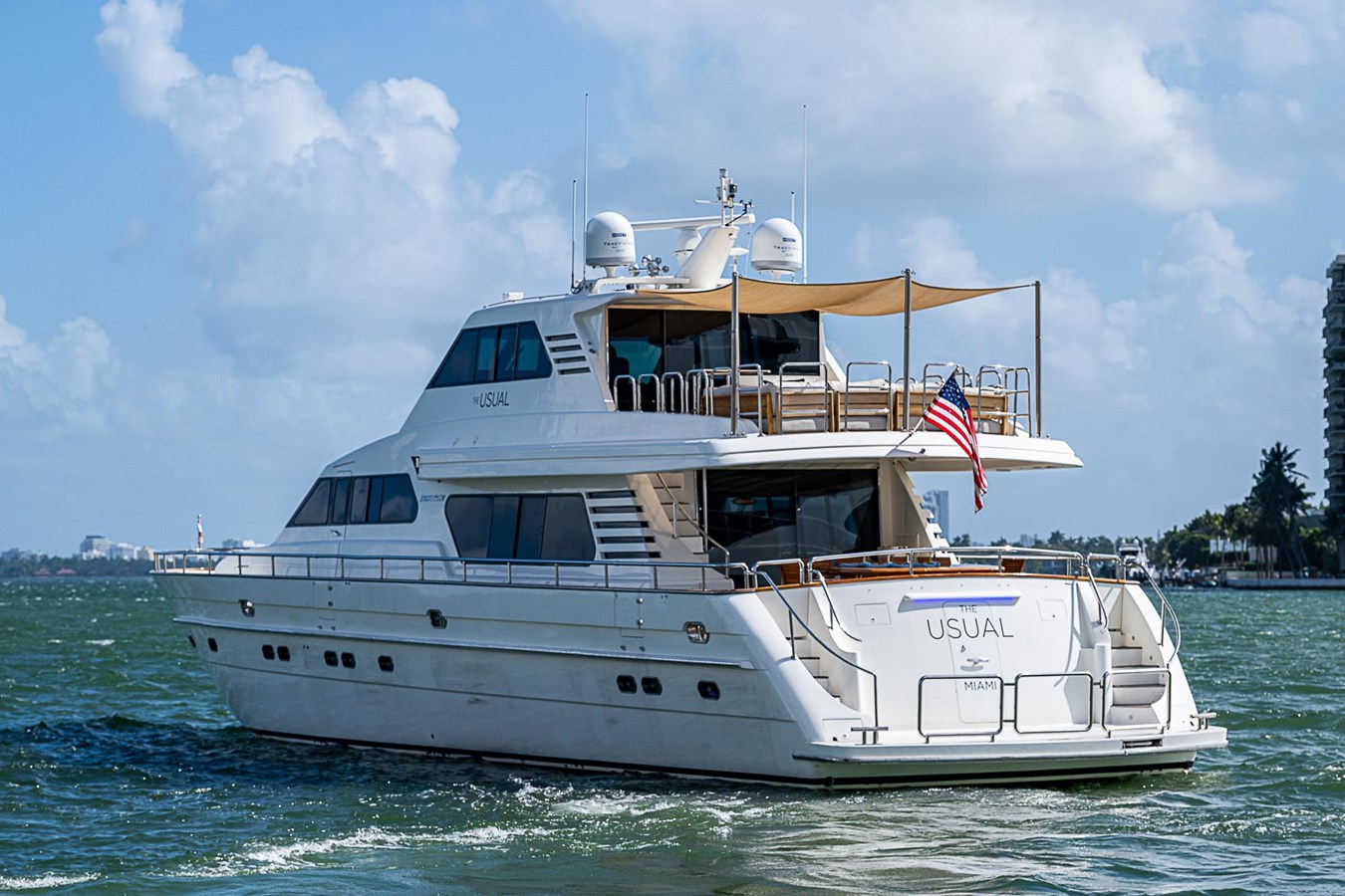 Coming aboard The Usual is done from either the starboard or port side bulwark doors with boarding passerelle where the aft main deck welcomes you. This space is great for outside dining, and entertaining having a large settee, a large table, teak decks, overhead, and recessed lighting. The two bulwark doors aft lead down to the transom swim platform. Moving forward from the aft main deck you have a sliding glass door providing access to the yacht’s interior, and foredeck walkways both starboard and port to access midship and the bow.