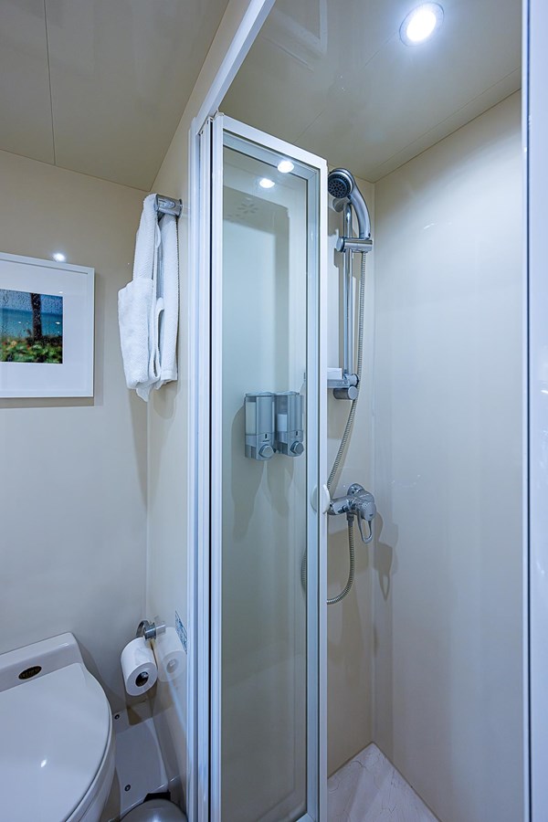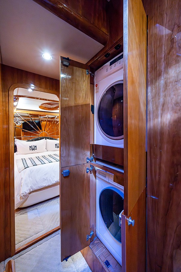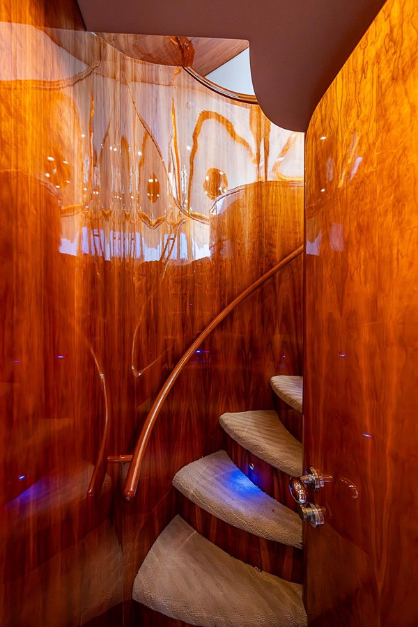 The engine room and crew quarters can both be accessed via the large centerline door off the transom or port side steps inside the salon.