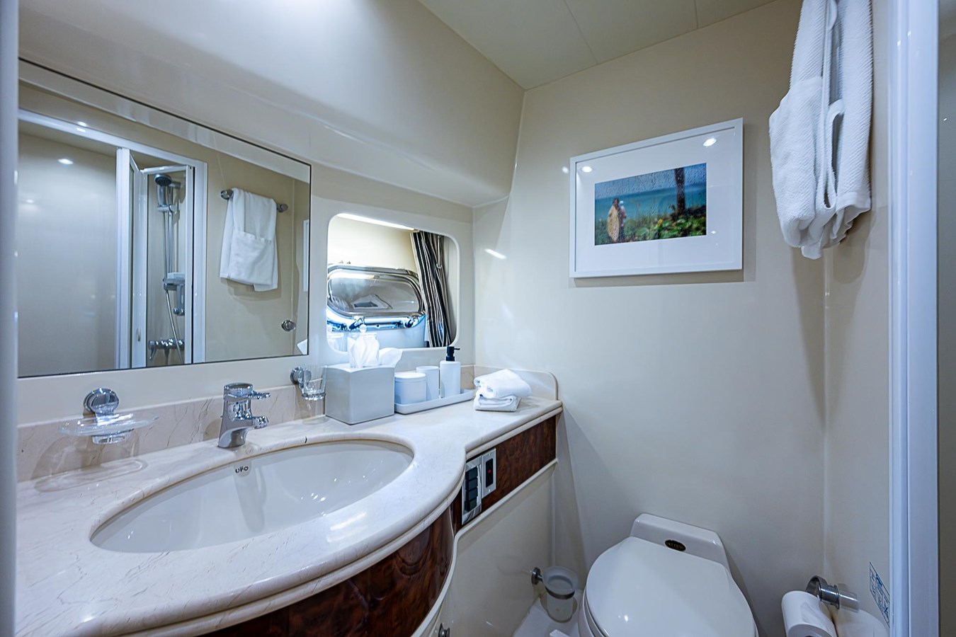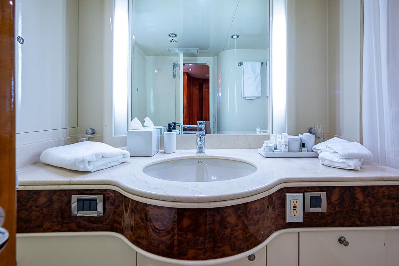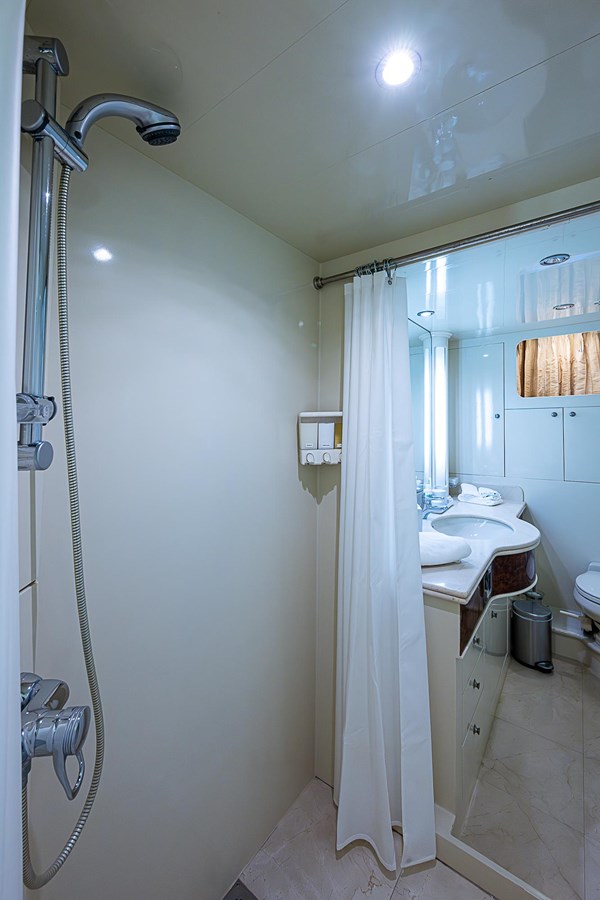 3 stateroom, 4 head layout (sleeps 6 guests) with separate 2 stateroom crew quarters for up to 4 crew.
