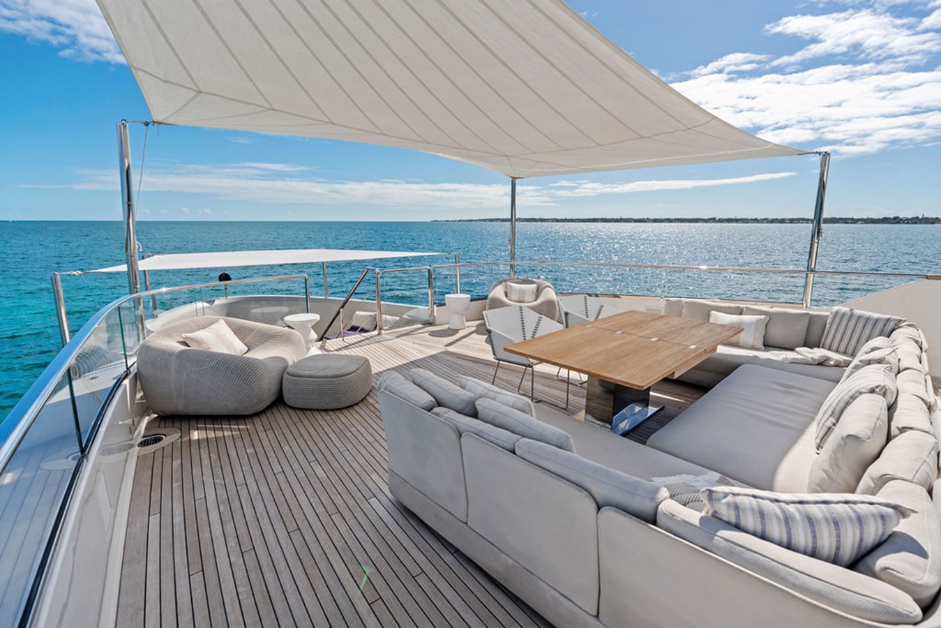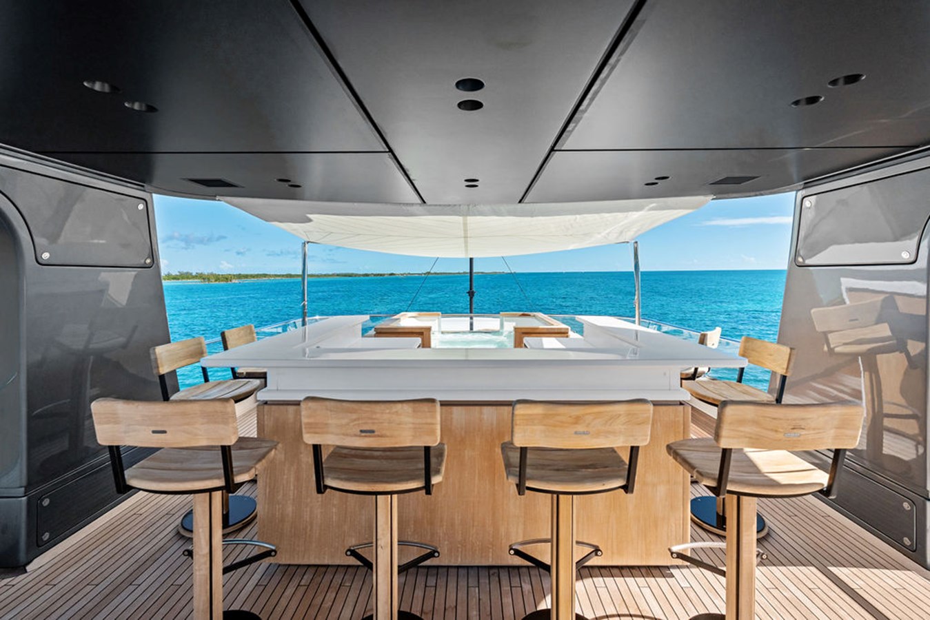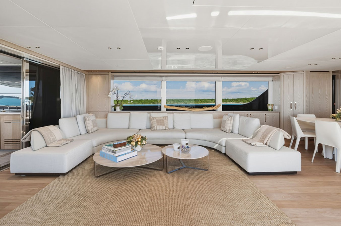 - Main Deck Aft: Just above the beach club, the main deck aft is designed as an inviting social hub. A generous fixed sofa faces the saloon, offering a comfortable and relaxed setting for conversation, cocktails, or simply enjoying the view while underway or at anchor.