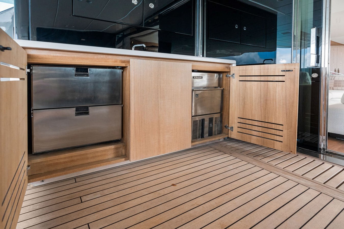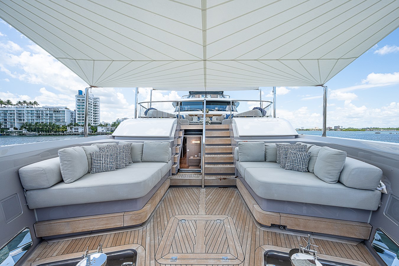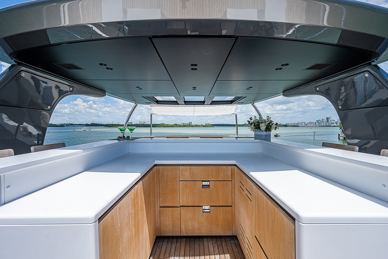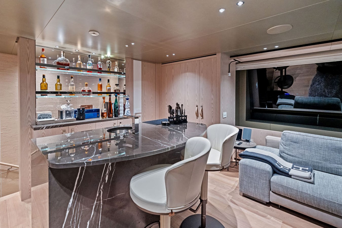 - Main Deck Aft: Just above the beach club, the main deck aft is designed as an inviting social hub. A generous fixed sofa faces the saloon, offering a comfortable and relaxed setting for conversation, cocktails, or simply enjoying the view while underway or at anchor.