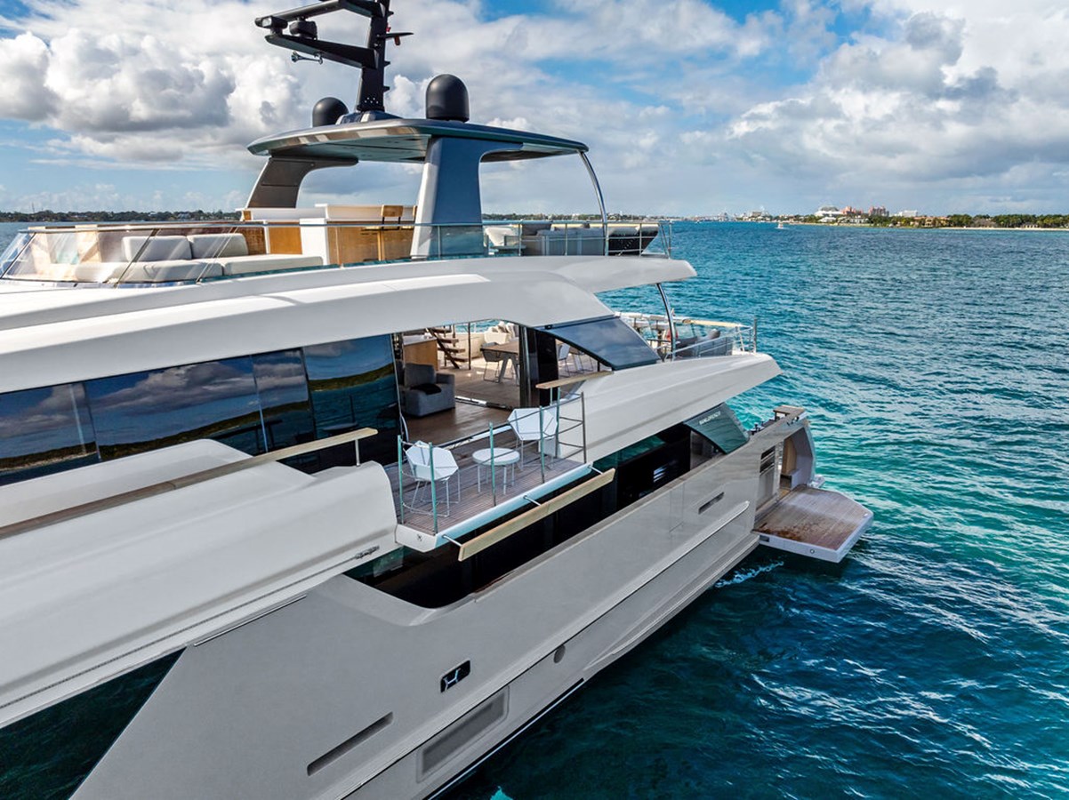 - Stern and Beach Club: When at anchor, the yacht’s stern seamlessly unfolds into an expansive 20-square-meter beach club, creating a true waterside retreat. Fold-down side terraces widen the platform and bring guests closer to the sea, while a hydraulically operated central transom section lowers effortlessly into the water, providing smooth access for tenders and an array of water toys.
