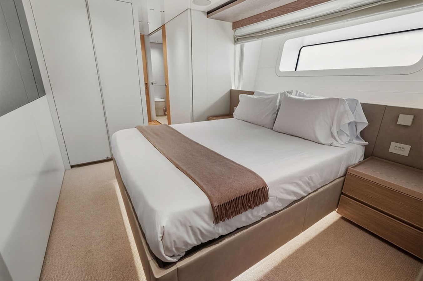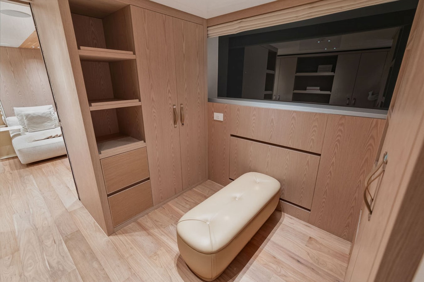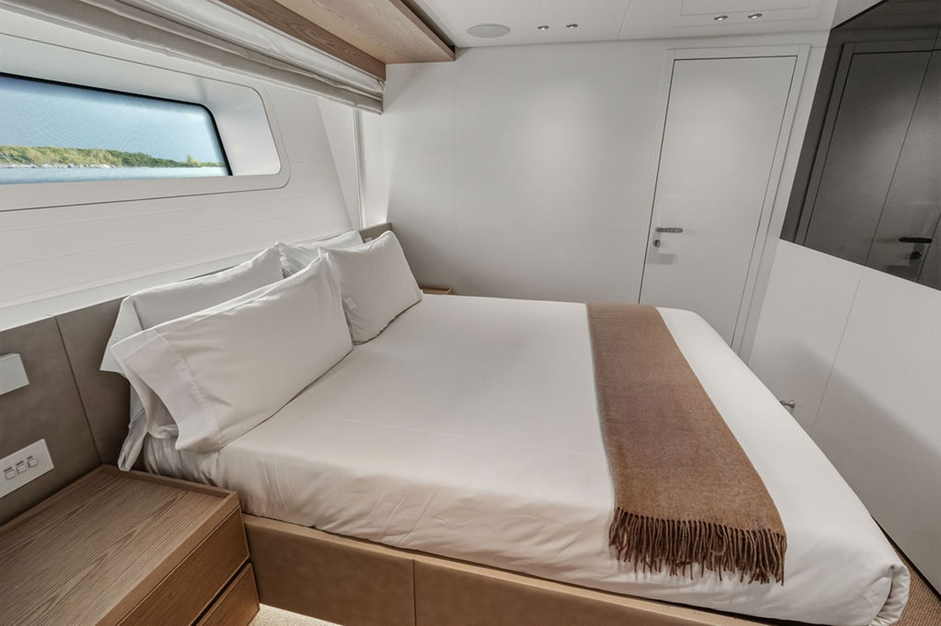 Step inside and you are welcomed by a custom interior by Marty Lowe, thoughtfully curated to feel both contemporary and timeless. Natural textures, bespoke furnishings, and a calming, sophisticated palette create a warm residential atmosphere, one that feels instantly inviting and entirely unique. This is a yacht designed to be lived on, not just admired.