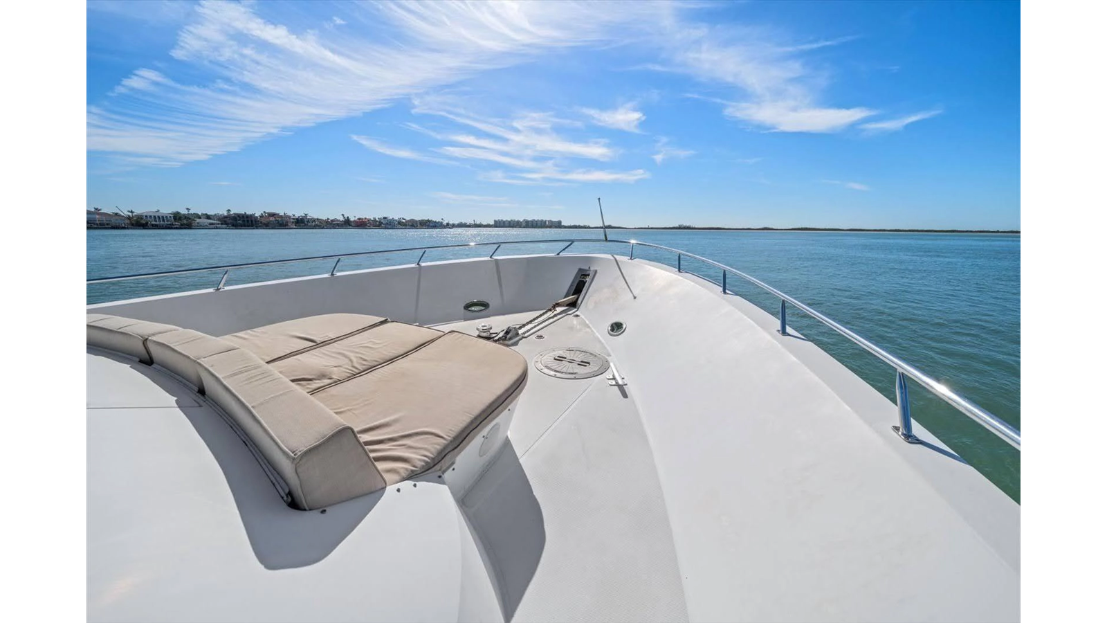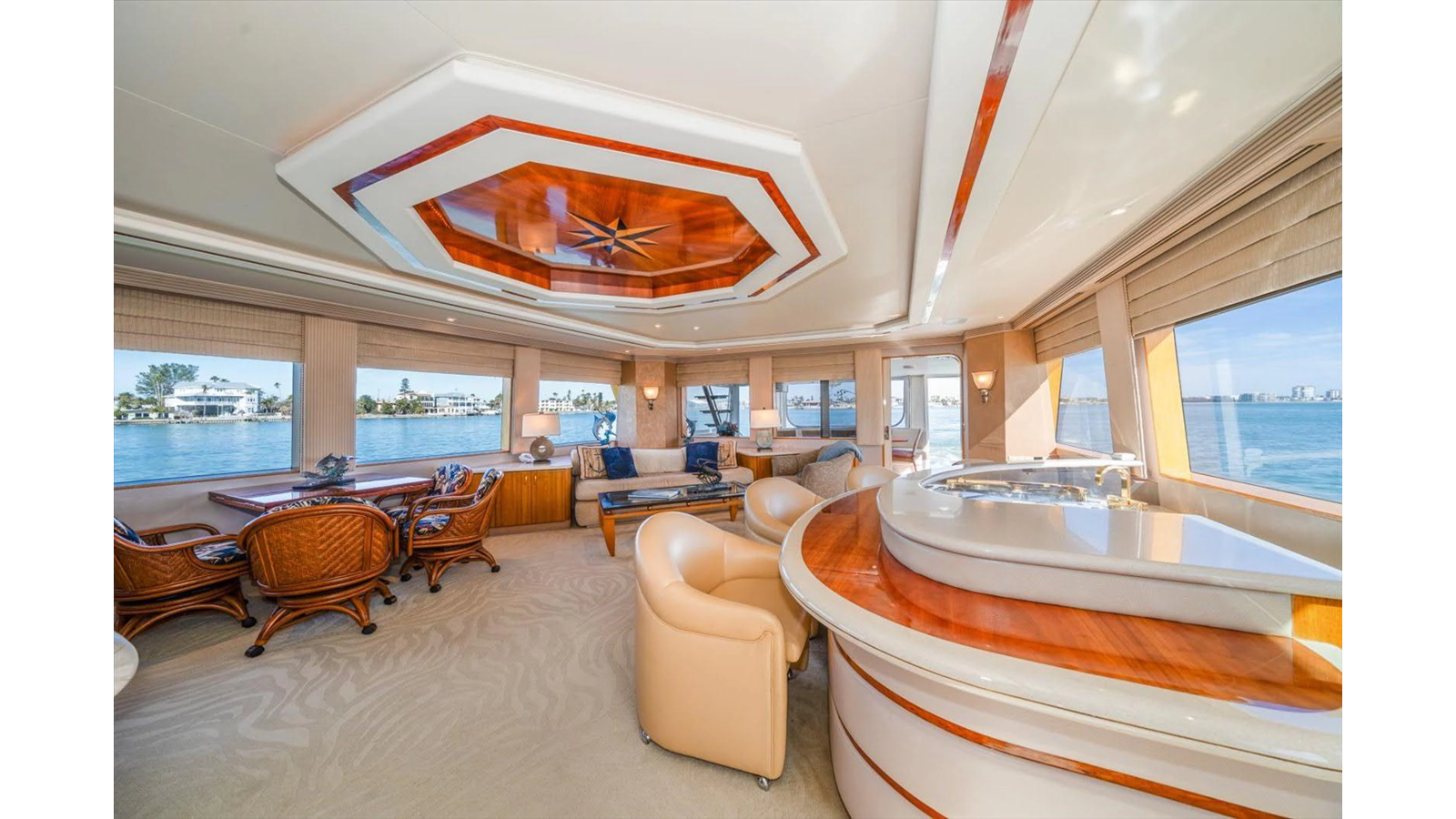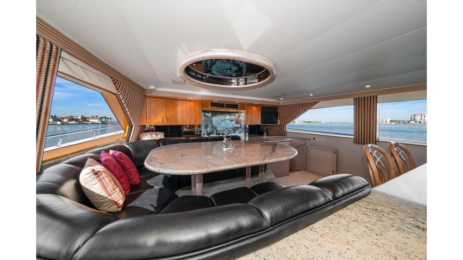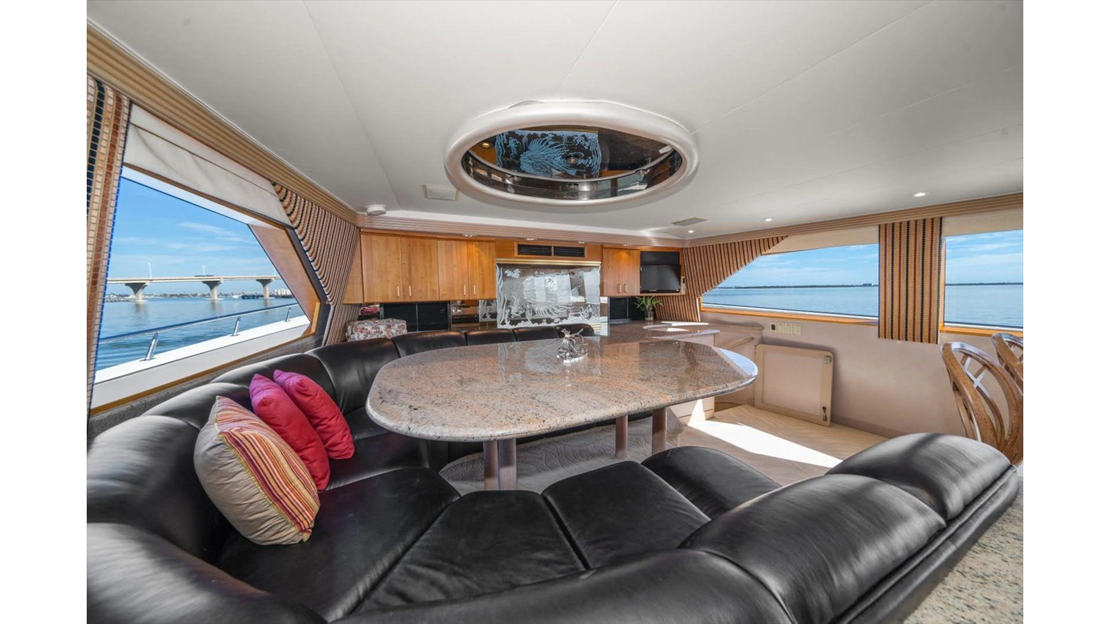 The Flybridge/Sundeck is extremely large with a Jacuzzi in the center. There is a custom wet bar with 4 stools and a whirlpool icemaker. Starboard dinette seating for 15-20 people. There are three custom Steel Crown chairs raised and have footrests to accompany the captain while cruising. A sundeck measuring a massive 19ft x 13ft area.