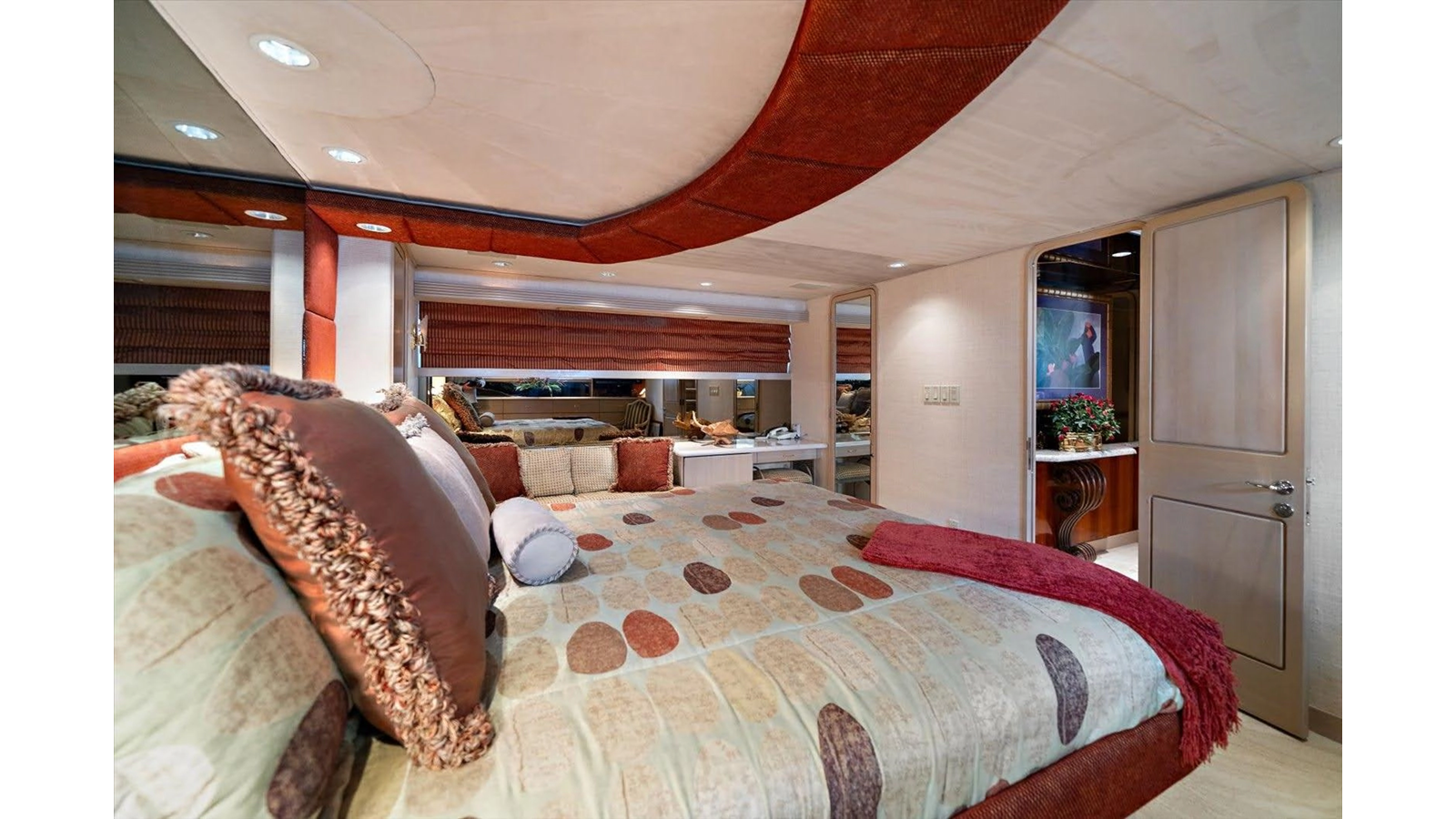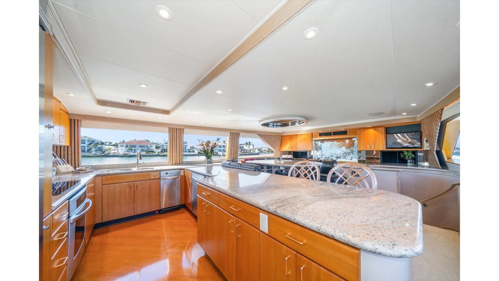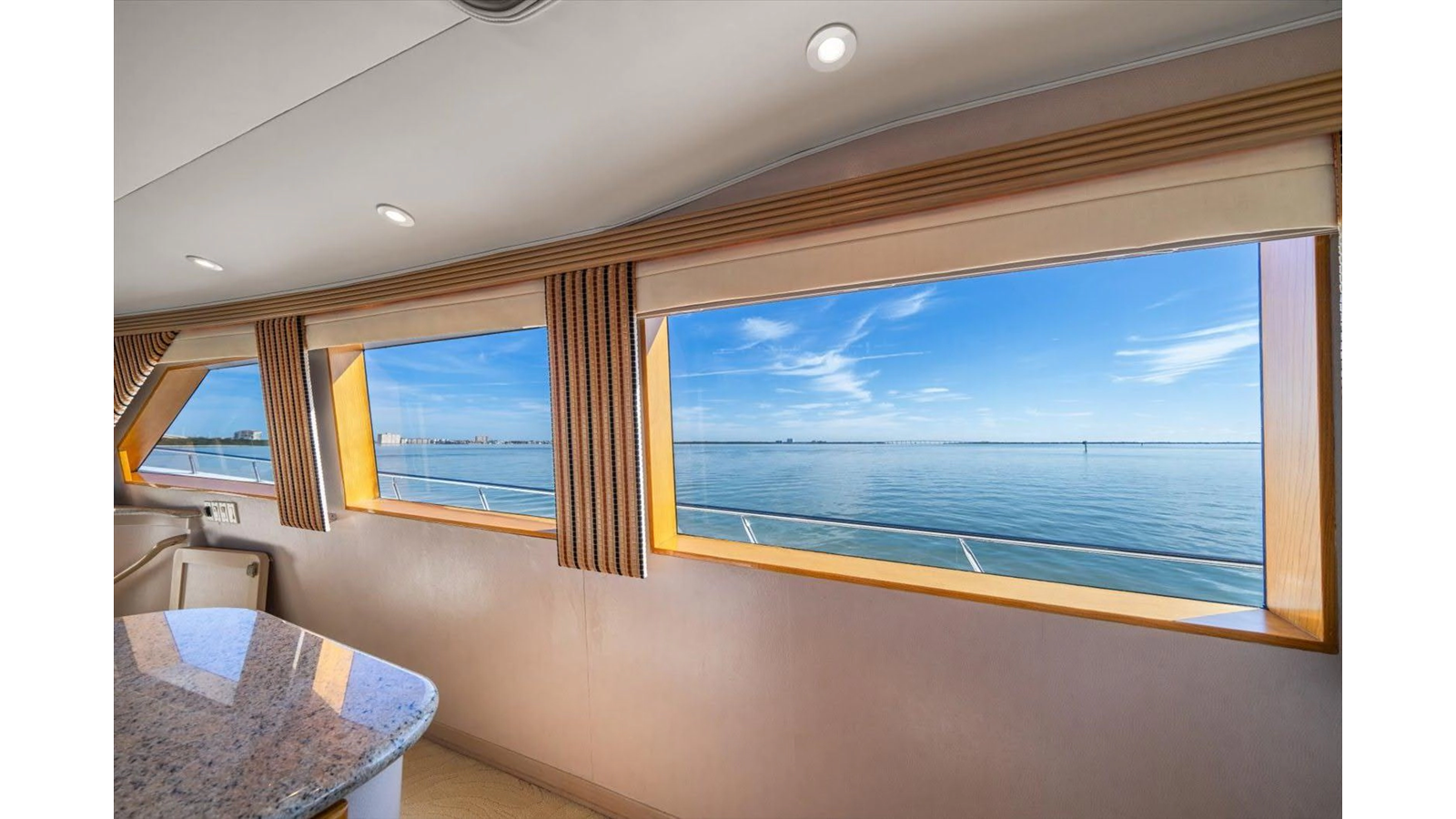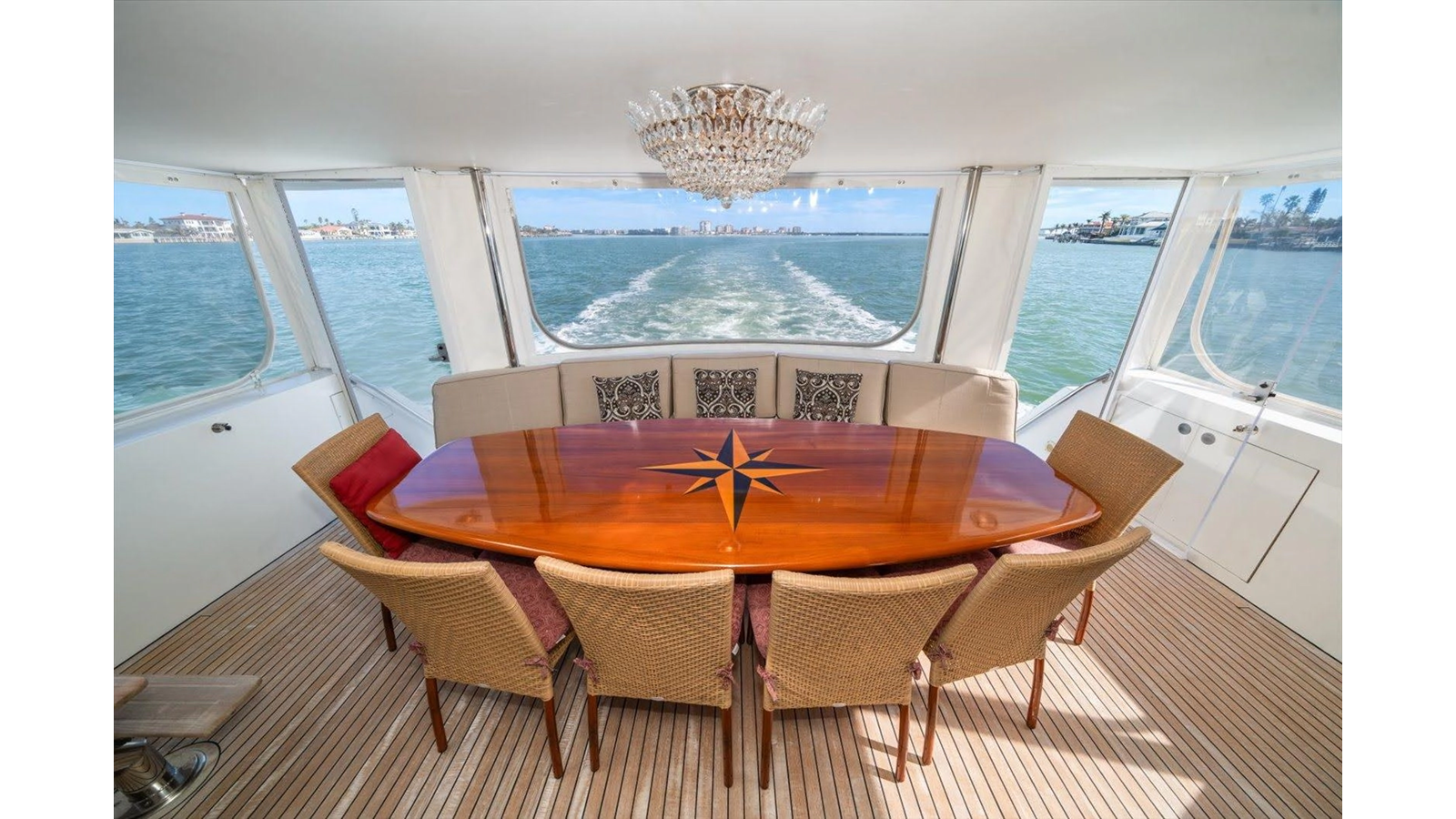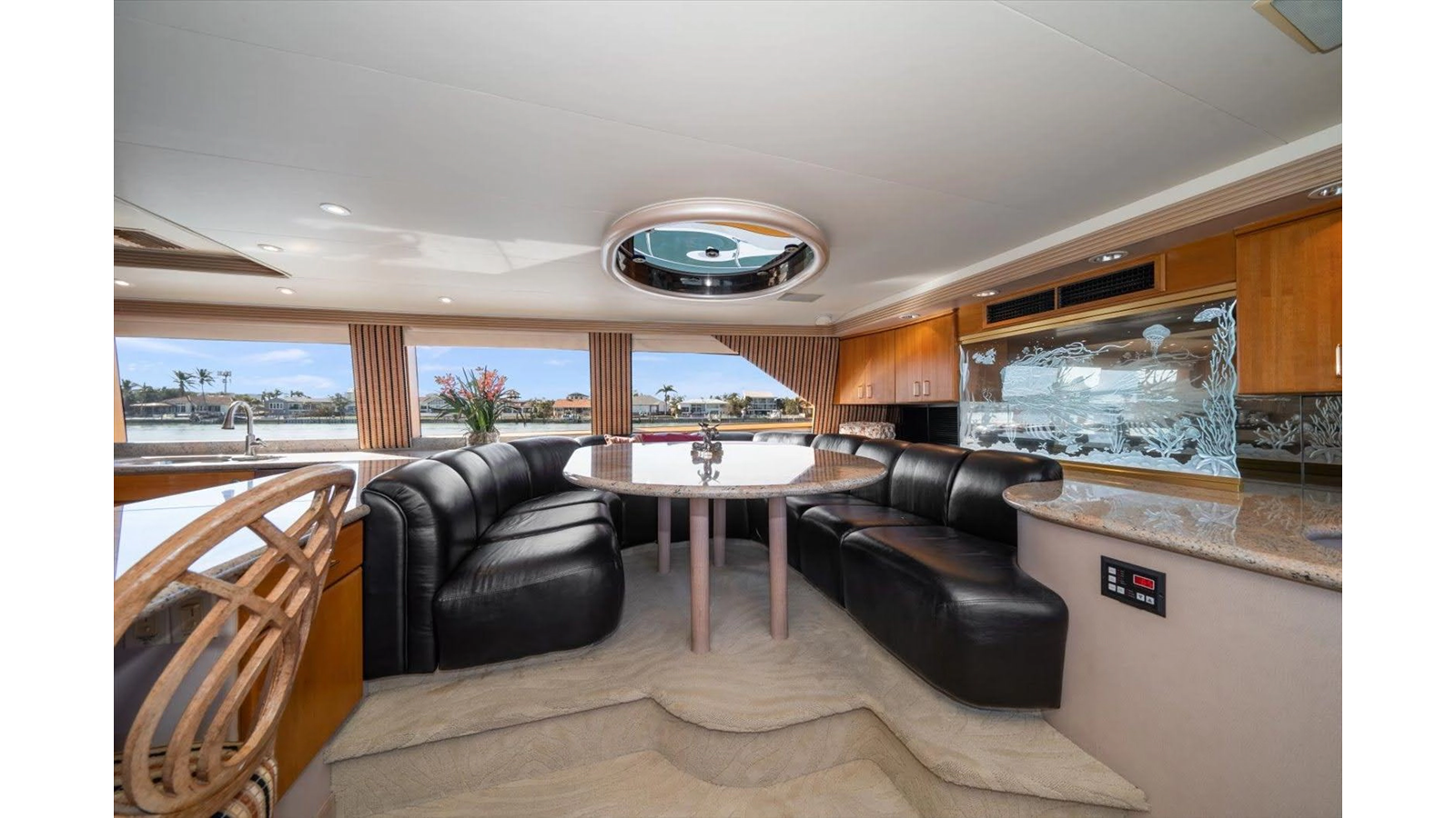 The Flybridge/Sundeck is extremely large with a Jacuzzi in the center. There is a custom wet bar with 4 stools and a whirlpool icemaker. Starboard dinette seating for 15-20 people. There are three custom Steel Crown chairs raised and have footrests to accompany the captain while cruising. A sundeck measuring a massive 19ft x 13ft area.
