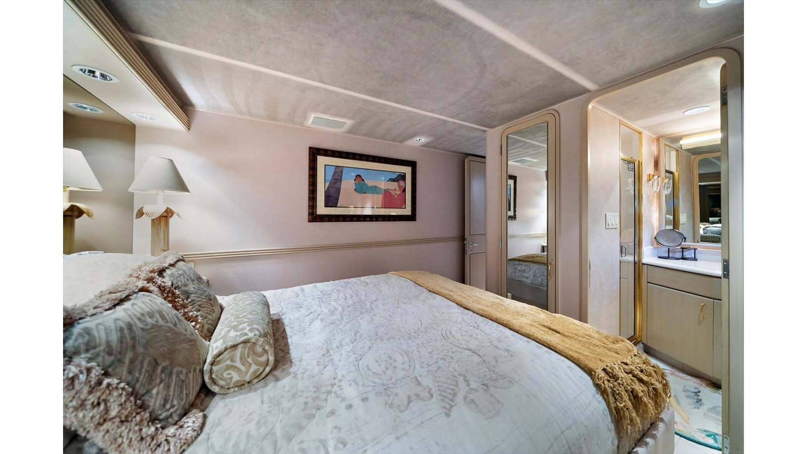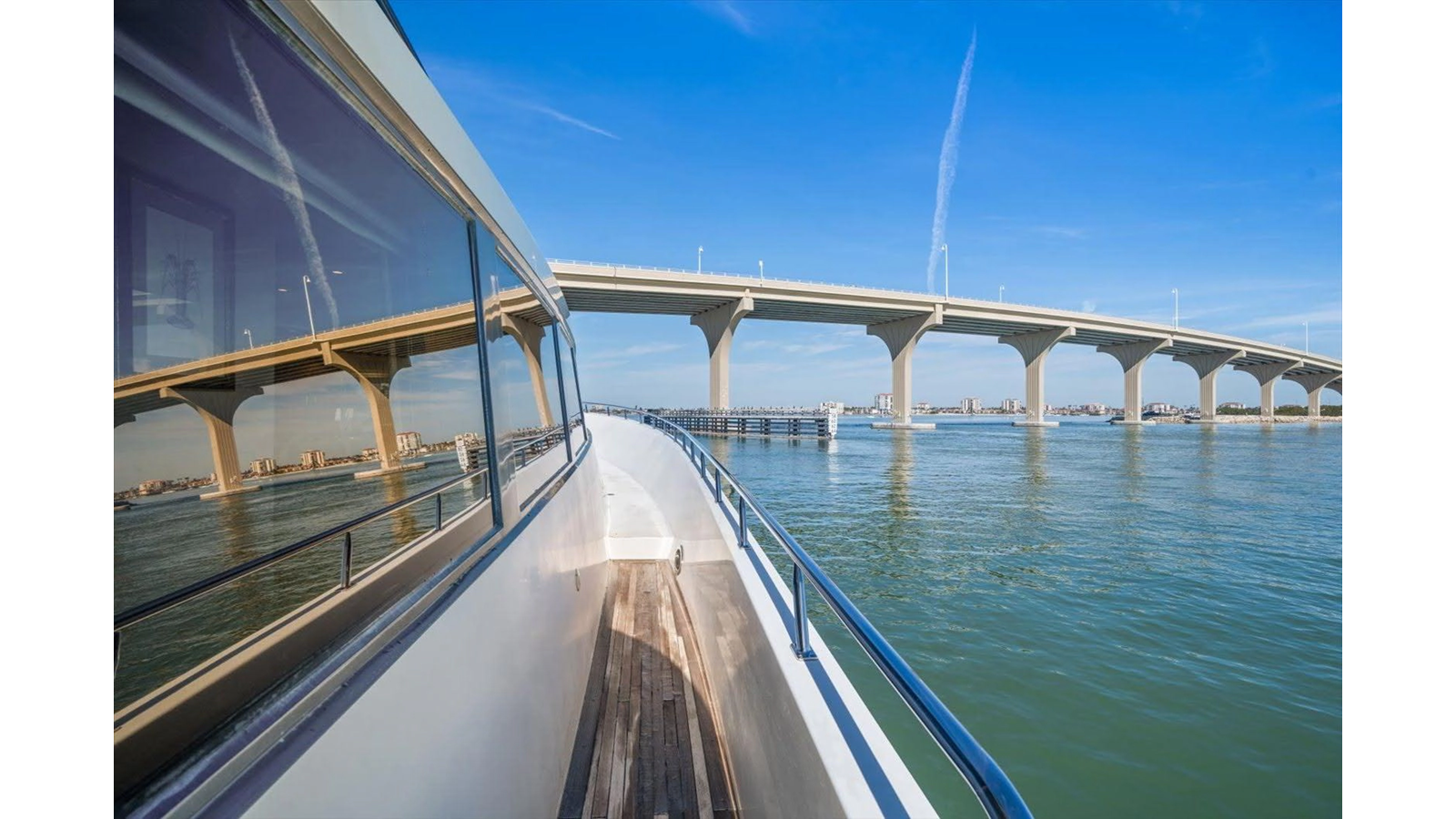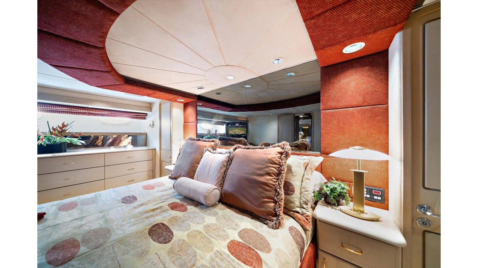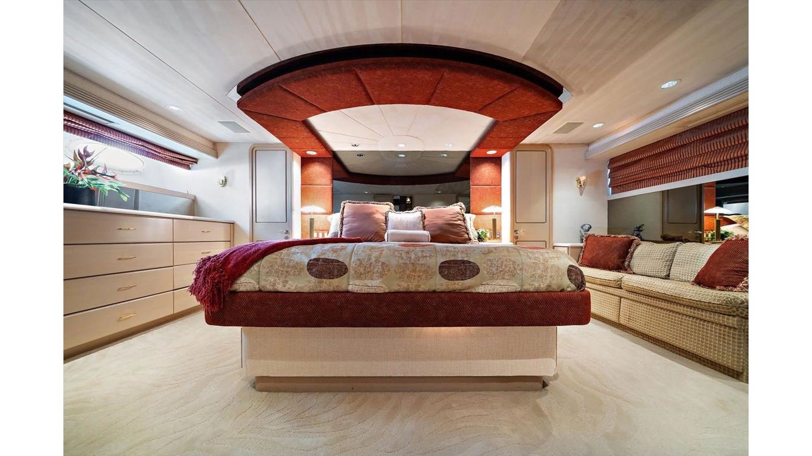 The Flybridge/Sundeck is extremely large with a Jacuzzi in the center. There is a custom wet bar with 4 stools and a whirlpool icemaker. Starboard dinette seating for 15-20 people. There are three custom Steel Crown chairs raised and have footrests to accompany the captain while cruising. A sundeck measuring a massive 19ft x 13ft area.