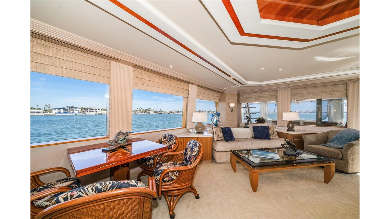 The open luxury Main Salon is very large with a custom entertainment center forward with custom wrap-around sofas.