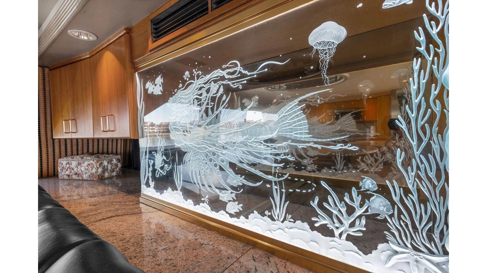 The couches are done in Chenille with four occasional barrel type bar chairs which can be pulled over for dining on the Hi-Lo table. The Main Salon ceiling is done with custom overhead treatments with three layers and five beveled molding throughout the Salon and the entire yacht. The walk-behind bar is step down to let the bar top be low enough not to obstruct the view from the other side of the Salon while seated.