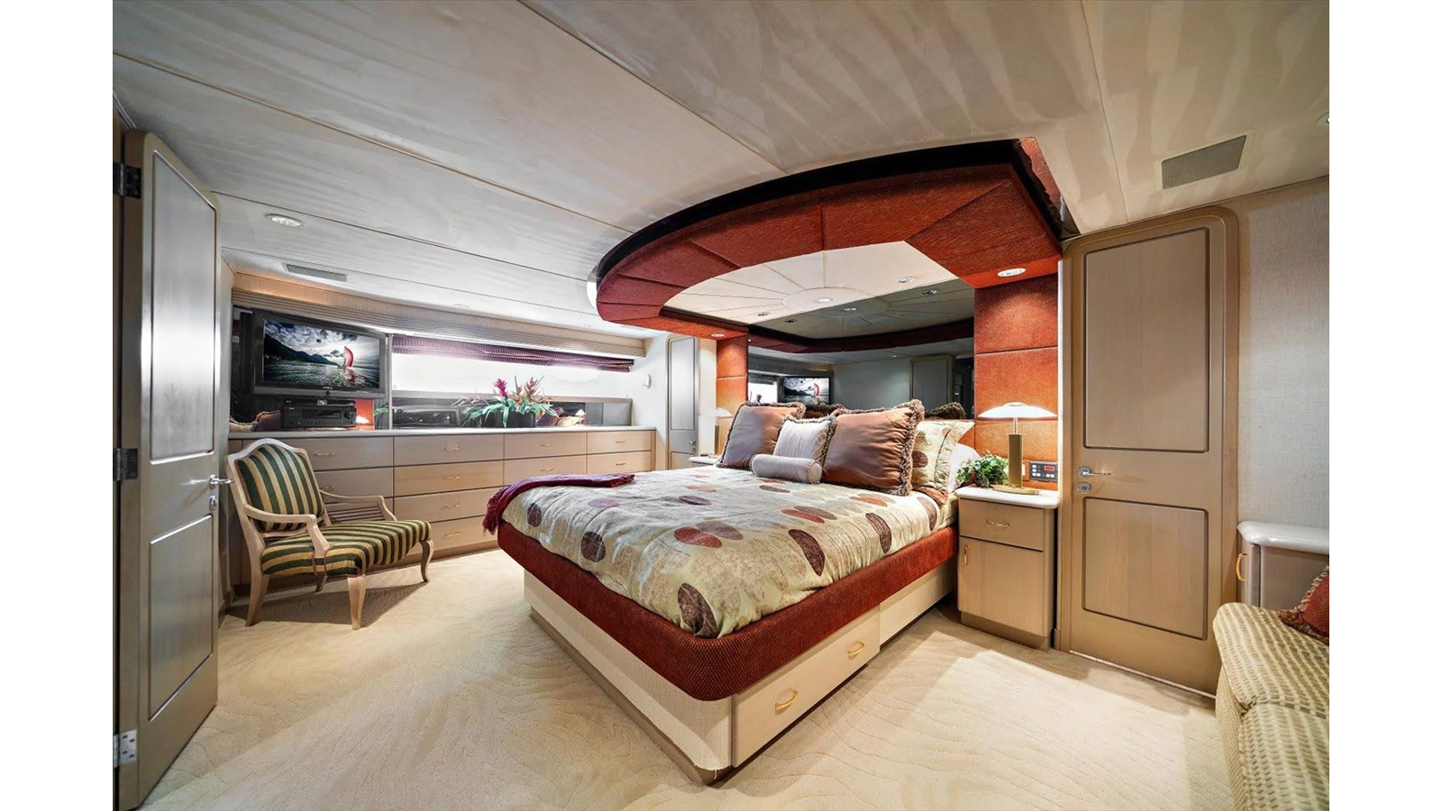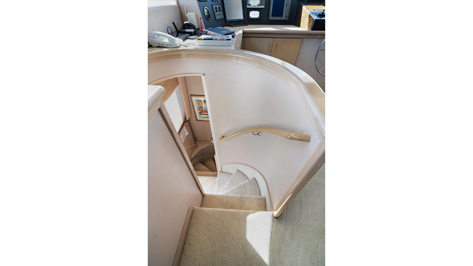 There is 1 master and 2 guest staterooms accessible from the port stairway. Once down at the bottom of the stairway, you will enter into a very elegant, tiled landing area/ foyer with access to all 3 staterooms with on suite heads.