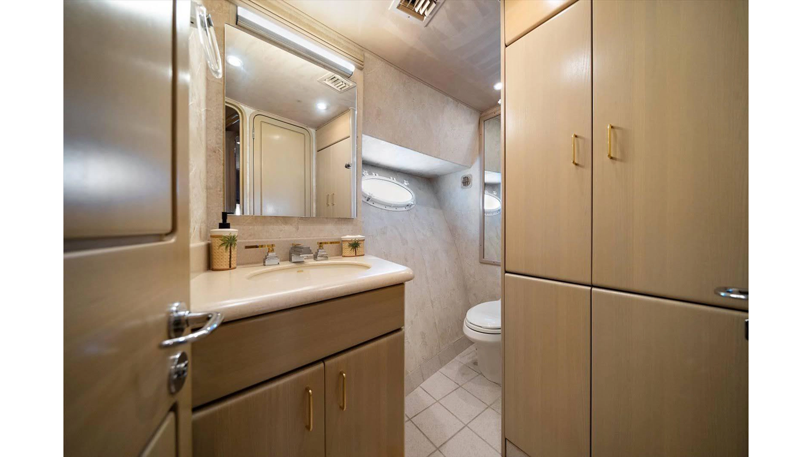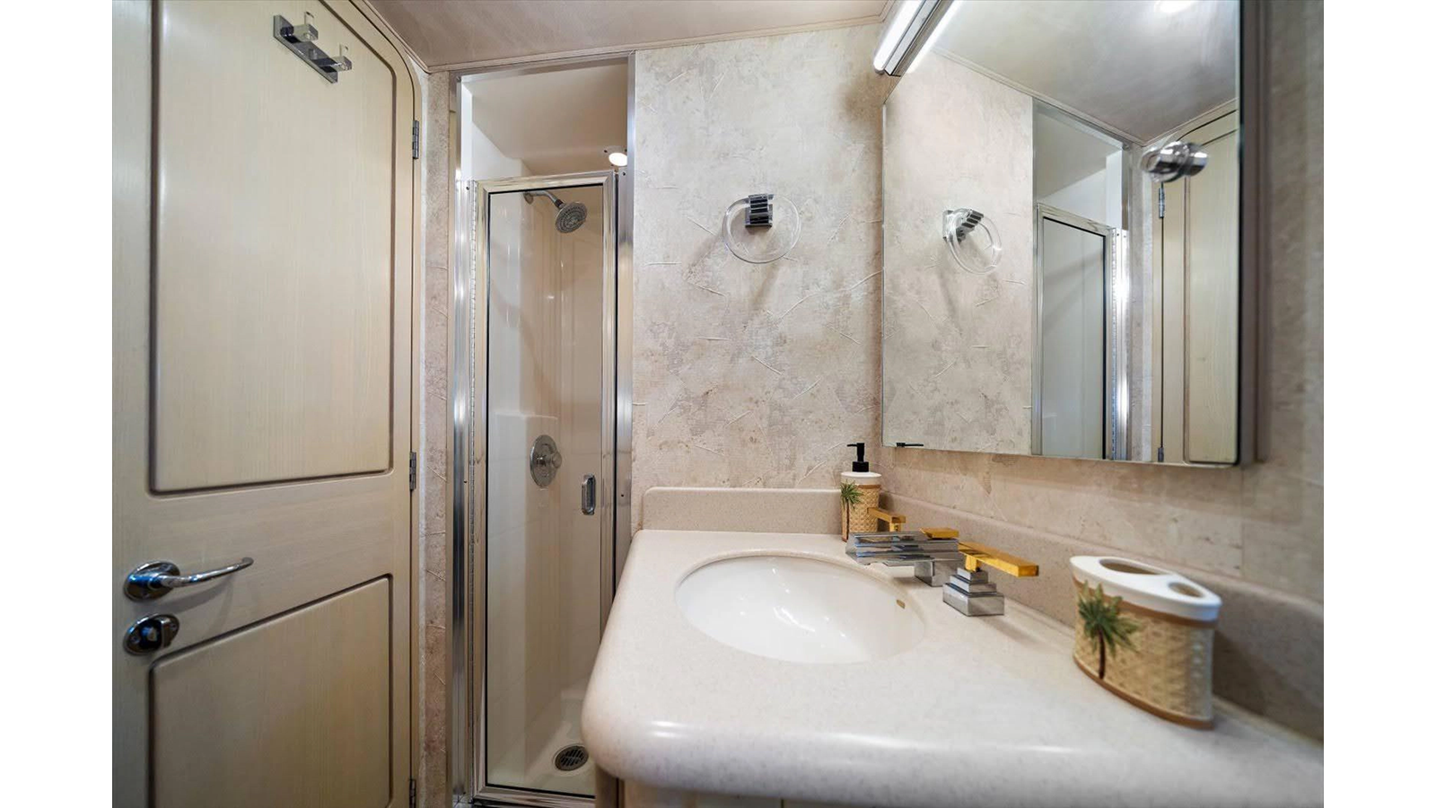 To starboard, there is a double birth (2 twin beds), to port there is a single birth (1 queen bed) and then there is a beautiful full beam king master suite, with sitting area with a large shower separating twin heads and vanities. All, of the guest staterooms have TV’s and audio equipment, large closets for plenty of storage and open space.