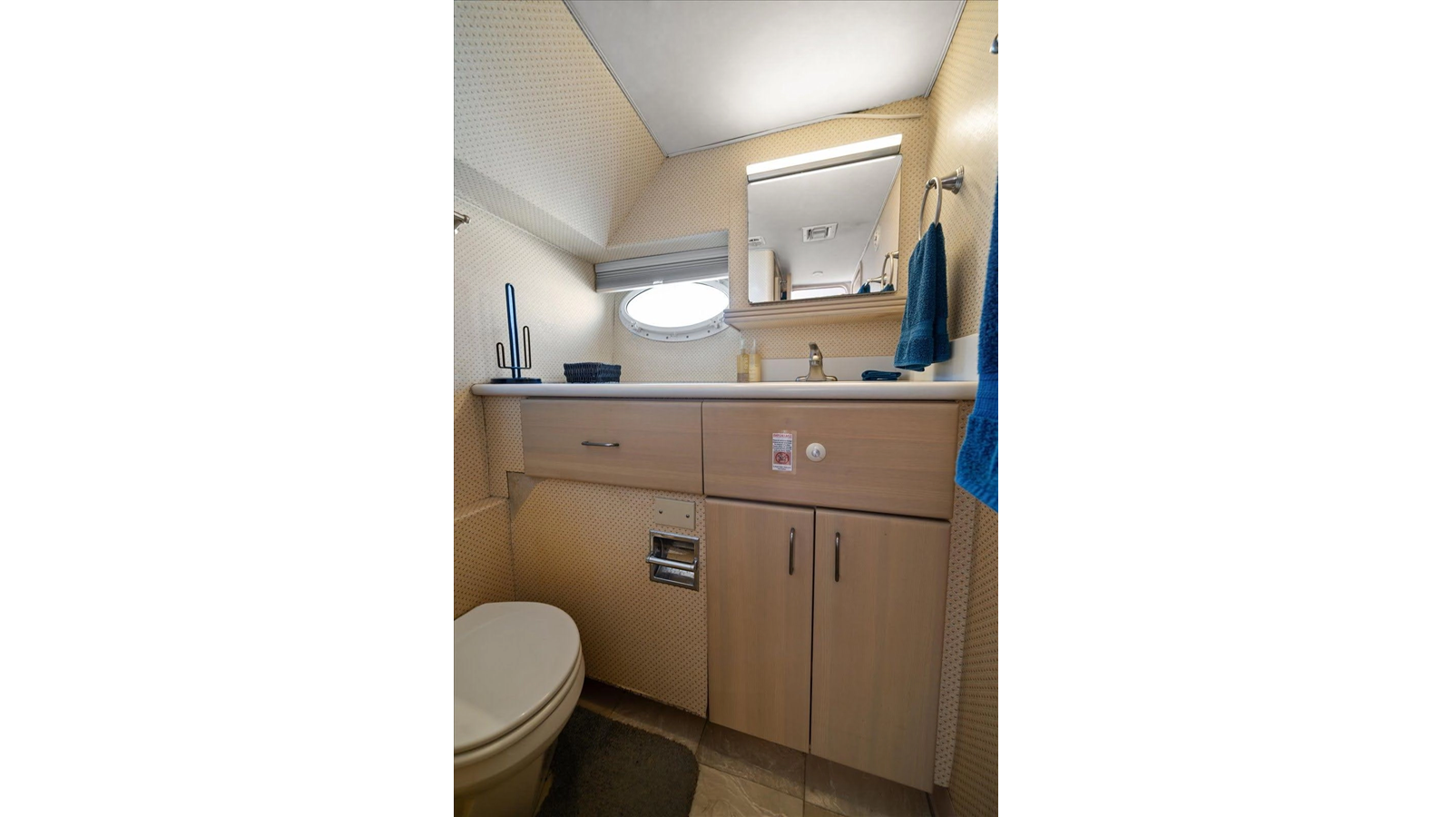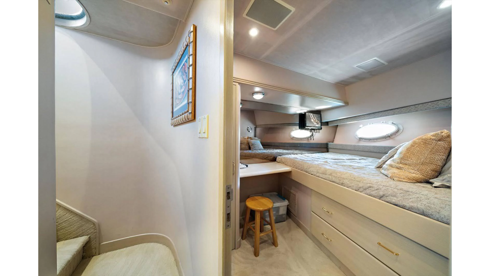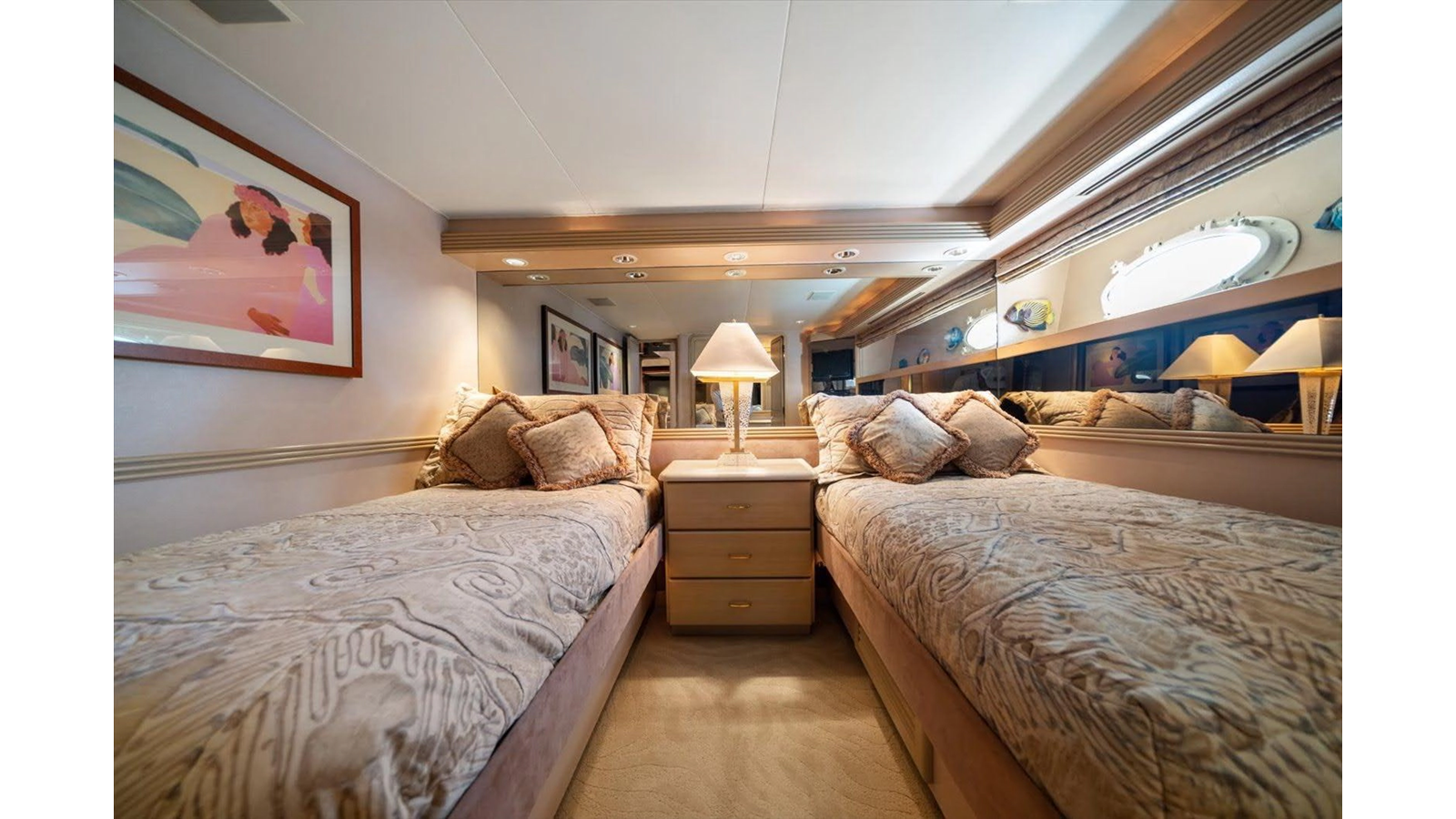 2 Guest staterooms are forward, accessible from the starboard side stairway with an ensuite single head and shower, starboard side. Forward, is a twin double berth (2 twin beds), and to port is a single double birth (1 full bed).