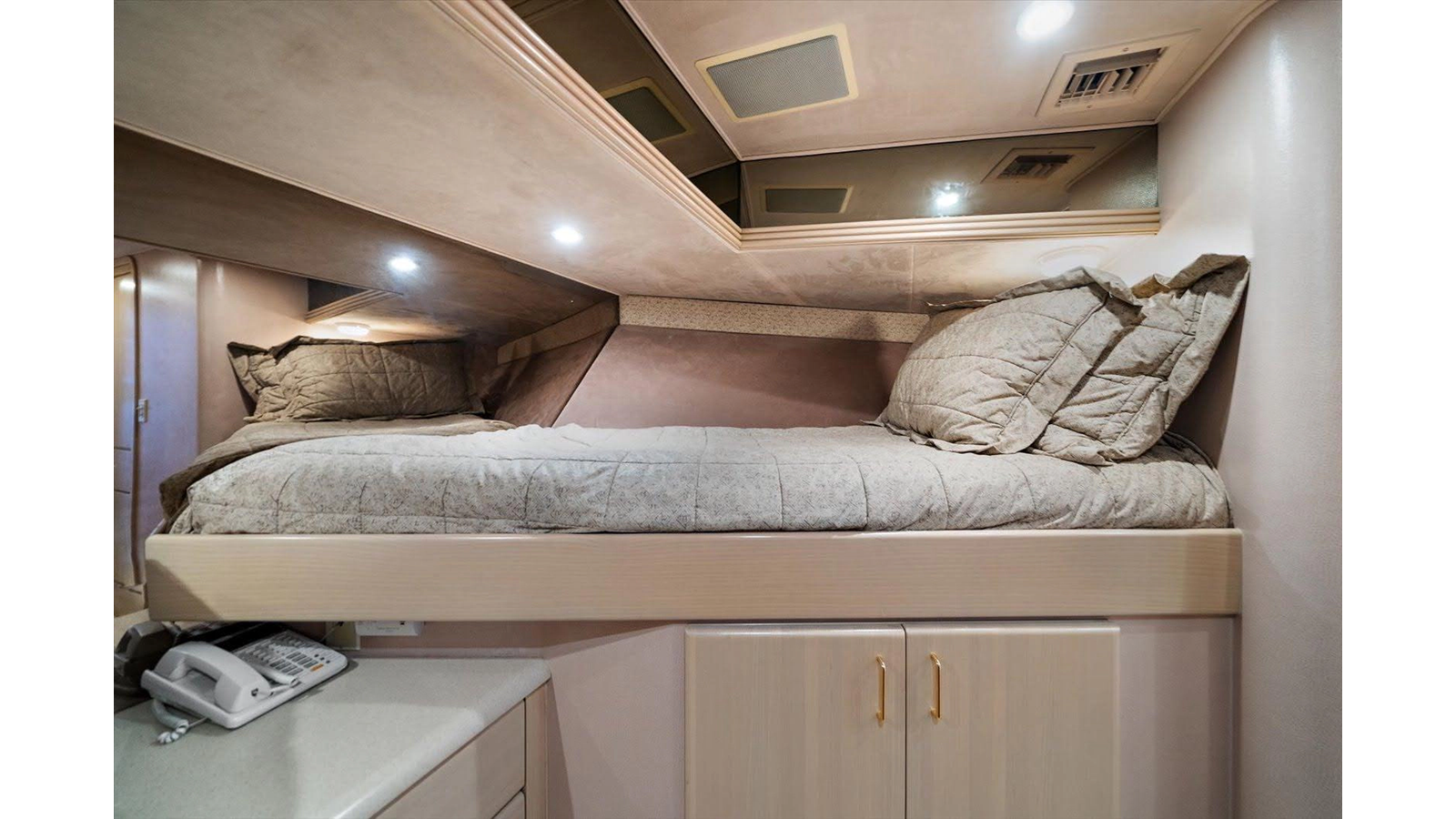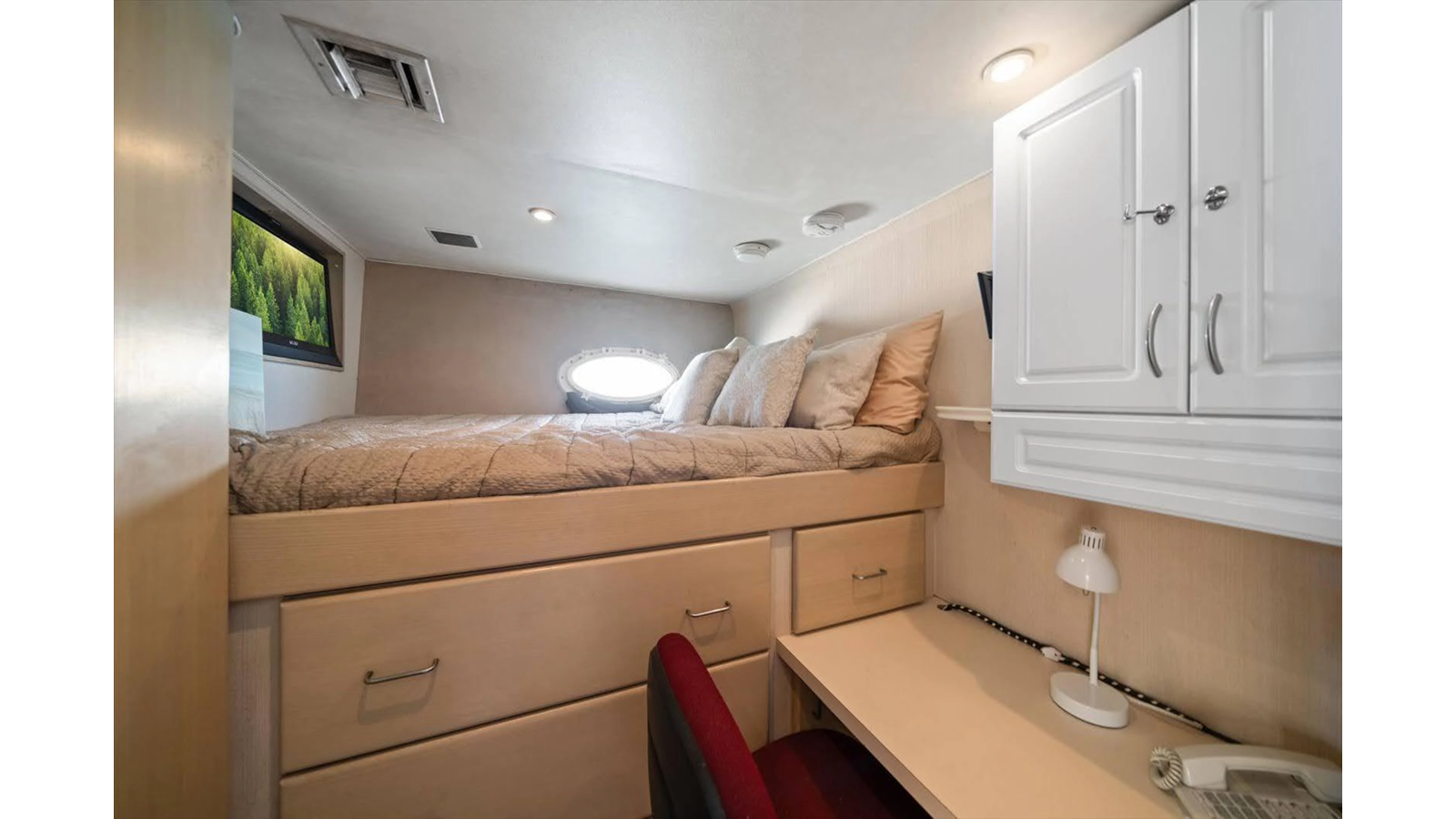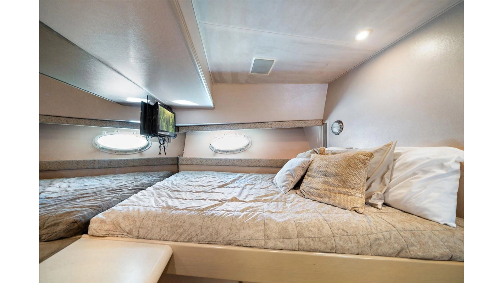 2 Guest staterooms are forward, accessible from the starboard side stairway with an ensuite single head and shower, starboard side. Forward, is a twin double berth (2 twin beds), and to port is a single double birth (1 full bed).