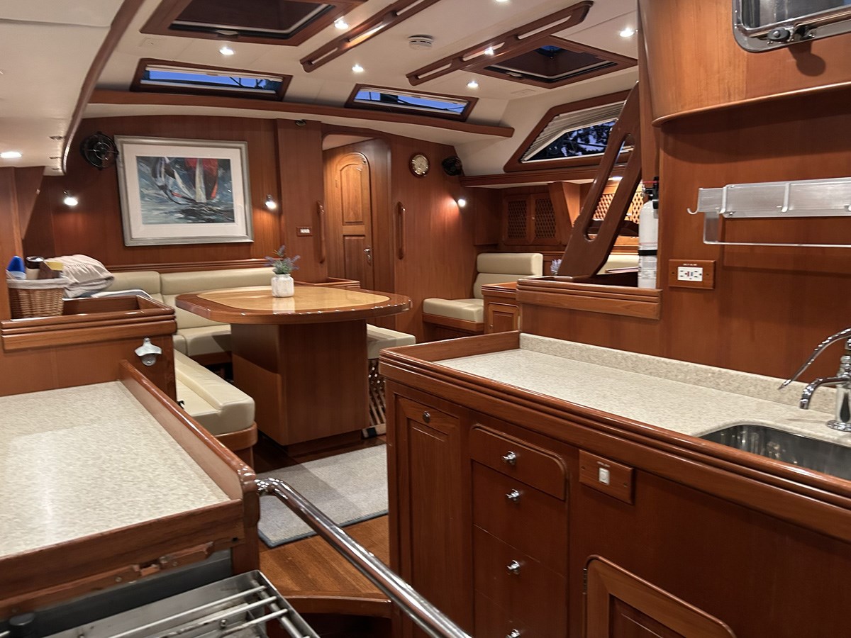 Aft and to port is a long, spacious U-shaped galley designed to maximize counter and storage space. This galley is fully equipped for comfortable living at sea or on anchor, with several well thought out storage lockers for glass, dinnerware and appliances. Some of the many features include: