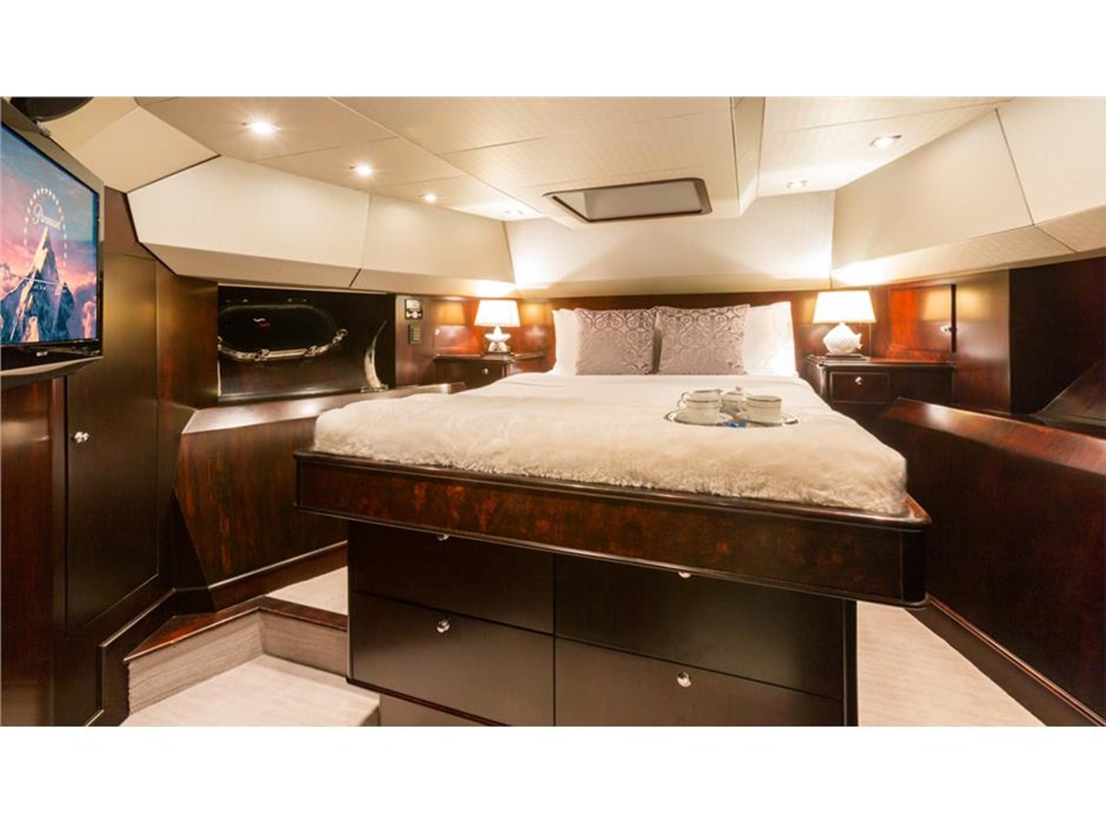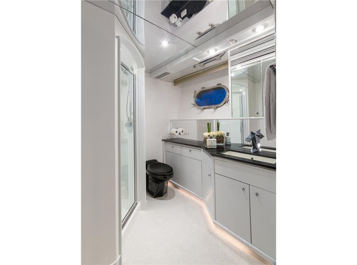 Four guest cabins, including a magnificent master cabin, accommodating up to 8 guests in extreme comfort. The master cabin takes up the full width of the yacht, featuring a king-sized bed and a marble-clad bathroom. Two further cabins have queen-sized beds and the large fourth cabin has twin beds. All cabins are below deck and are en-suite with Apple TV, iPad controls, and individual climate control.