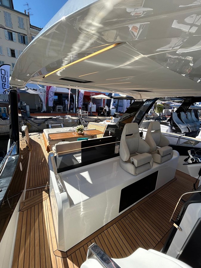 Le hardtop offre une protection complète contre les intempéries avec un pare-soleil intégré extensible. En dessous, le cockpit se reconfigure avec des dossiers mobiles et une table centrale pliable qui se transforme en un grand bain de soleil. Ouvrez les terrasses latérales hydrauliques et la poupe dégagée, et l’espace utilisable s’élargit de manière spectaculaire — généreux pour un 43 pieds, véritablement comparable à des plateformes plus grandes. La zone de bronzage à l’avant et la plateforme arrière transformable hydraulique complètent l’image de vie en plein air. Du teck synthétique recouvre l’ensemble du pont et des plateformes.