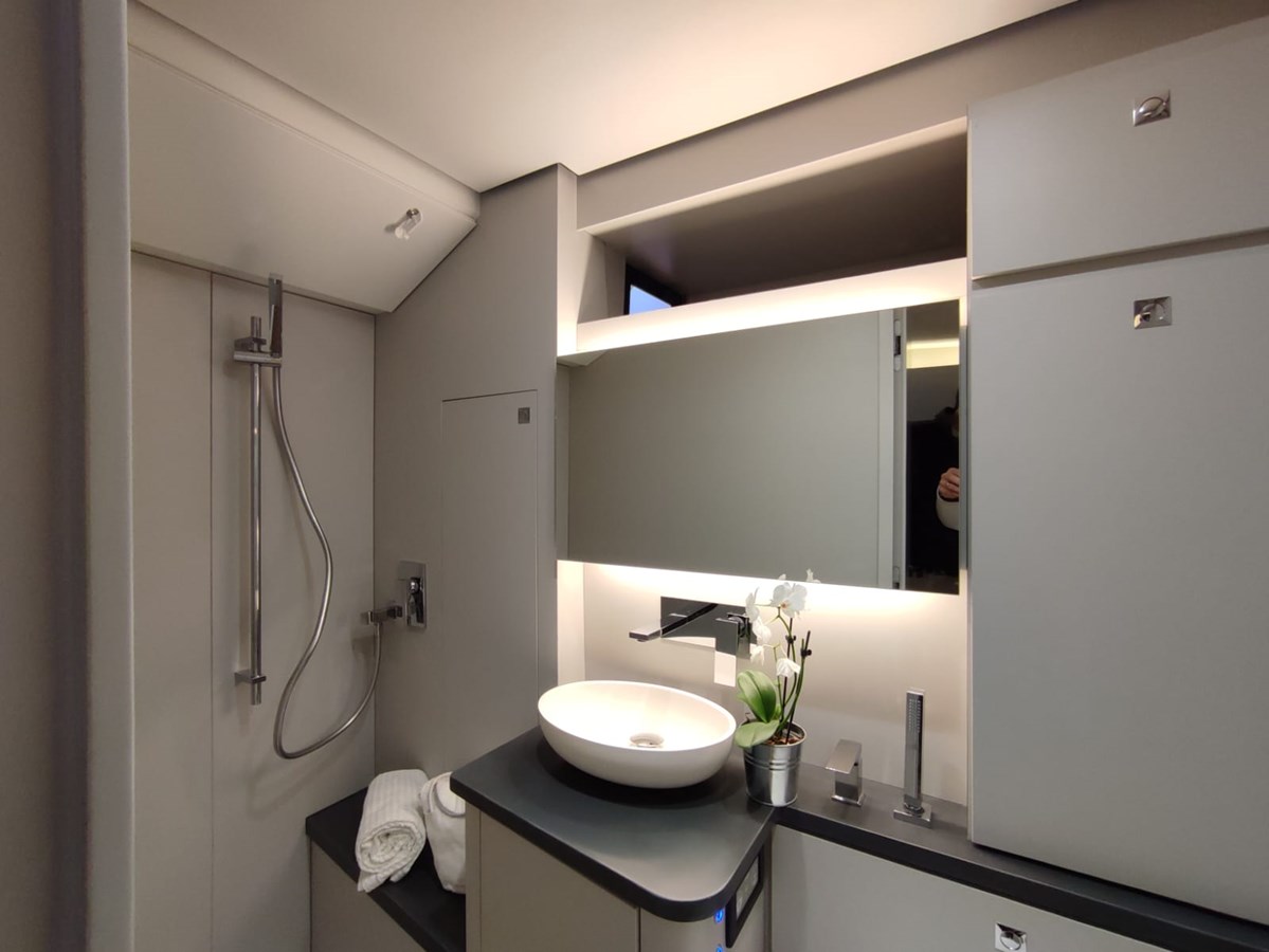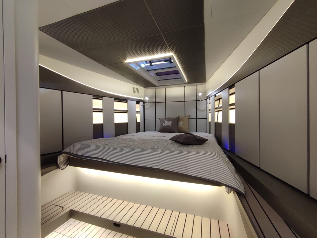Trois options de configuration sont disponibles : cabine principale à l’avant avec cabine double au milieu du navire. Toutes sont finies avec des matériaux clairs et des lignes épurées, en accord avec l’esthétique familiale d’Italia Yachts — moderne sans être froid, raffiné sans excès. La cabine au milieu du navire est à pleine largeur ; l’insonorisation est complète. Un véritable bateau pour passer la nuit et faire des trajets.