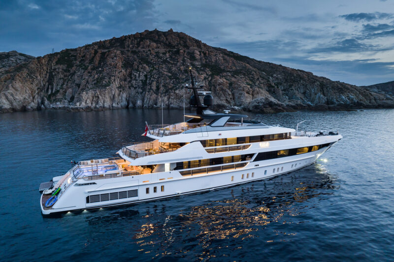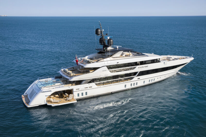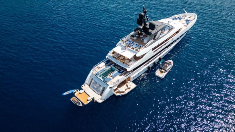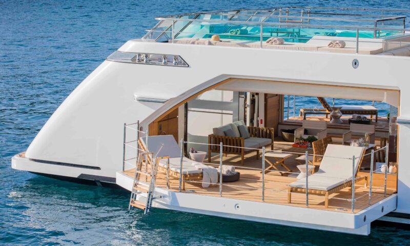 The yacht’s five-deck layout maximizes space and functionality. Highlights include a spacious beach club featuring a striking glass-bottom pool, multiple elegant lounges, and expansive windows that flood the interiors with natural light.