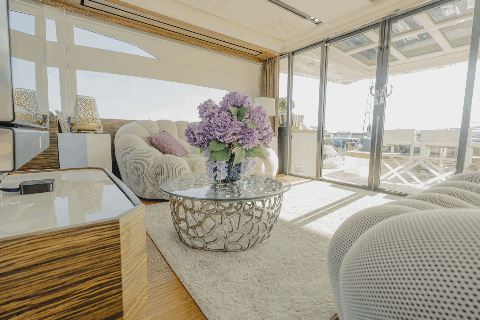 The exterior is designed for seamless entertaining, with a spacious saloon that opens to the cockpit and a retractable roof for a true open-air feel. The versatility continues with a grill and bar conveniently located at the cockpit sofa level. The vessel also features a tender garage and a hydraulic platform at the stern with direct access to the crew quarters for two.
